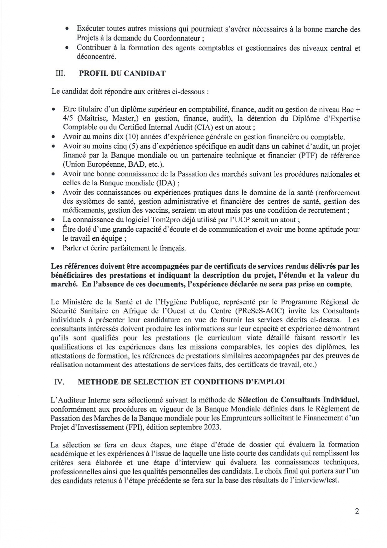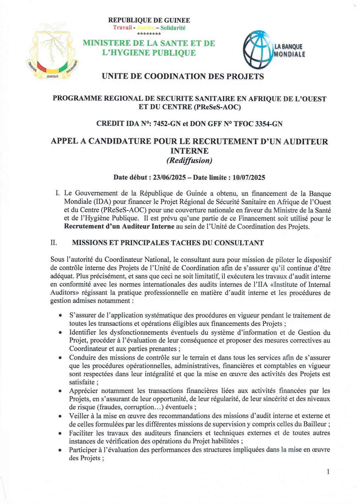 > APPEL A CANDIDATURE POUR LE RECRUTEMENT D’UN AUDITEUR INTERNE