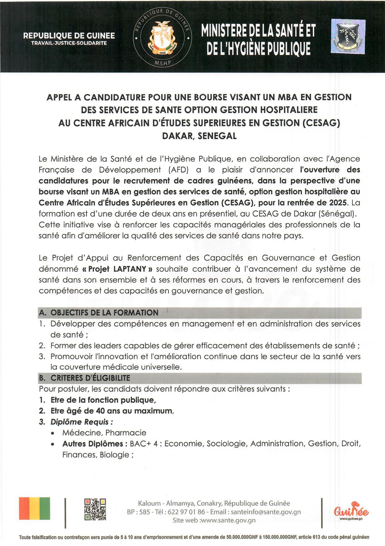 > APPEL A CANDIDATURE POUR UNE BOURSE VISANT UN MBA EN GESTION DES SERVICES DE SANTE OPTION GESTION HOSPITALIERE AU CENTRE AFRICAIN D'ÉTUDES SUPERIEURES EN GESTION (CESAG) DAKAR, SENEGAL