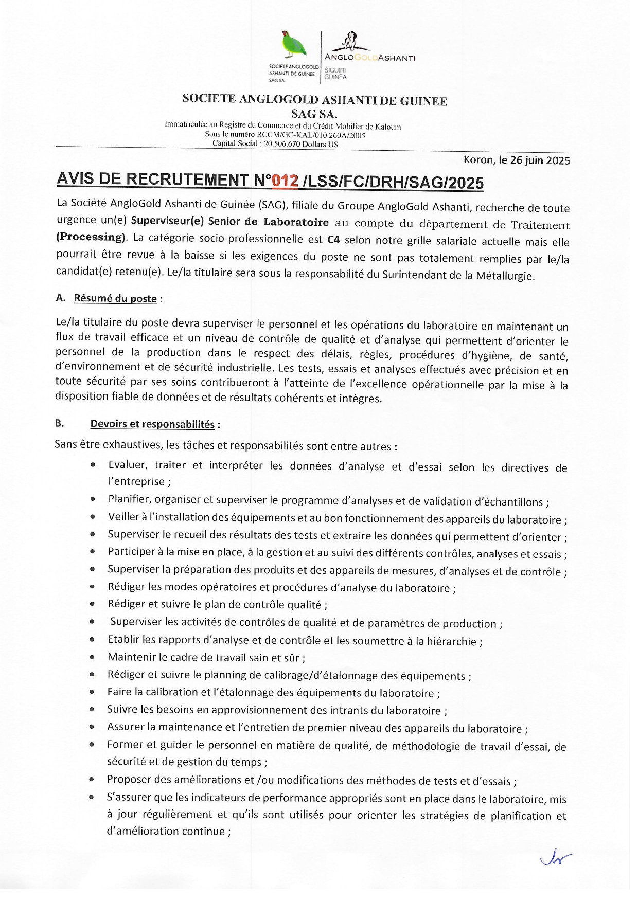 > Avis de recrutement d'un(e) Superviseur(e) Senior de Laboratoire au compte du département de Traitement (Processing)