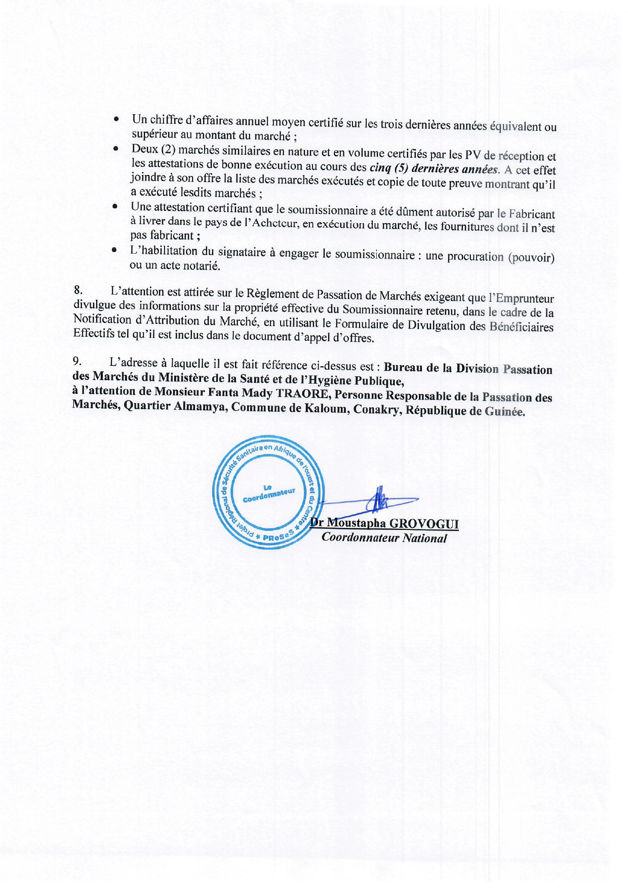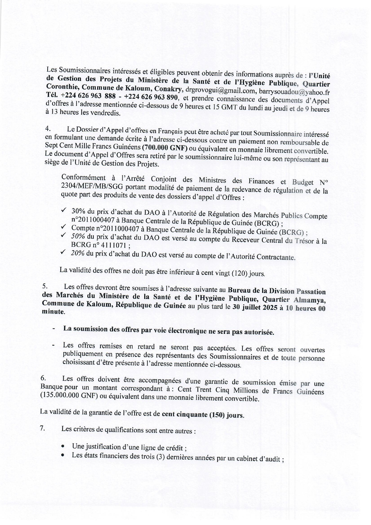 > Appel d'offres national pour l'Acquisition des réactifs et équipements pour les huit (8) laboratoire des hôpitaux régionaux du pays pour le compte de la Direction Nationale des Laboratoire (DNL) du Ministère de la Santé et de l'Hygiène Publique