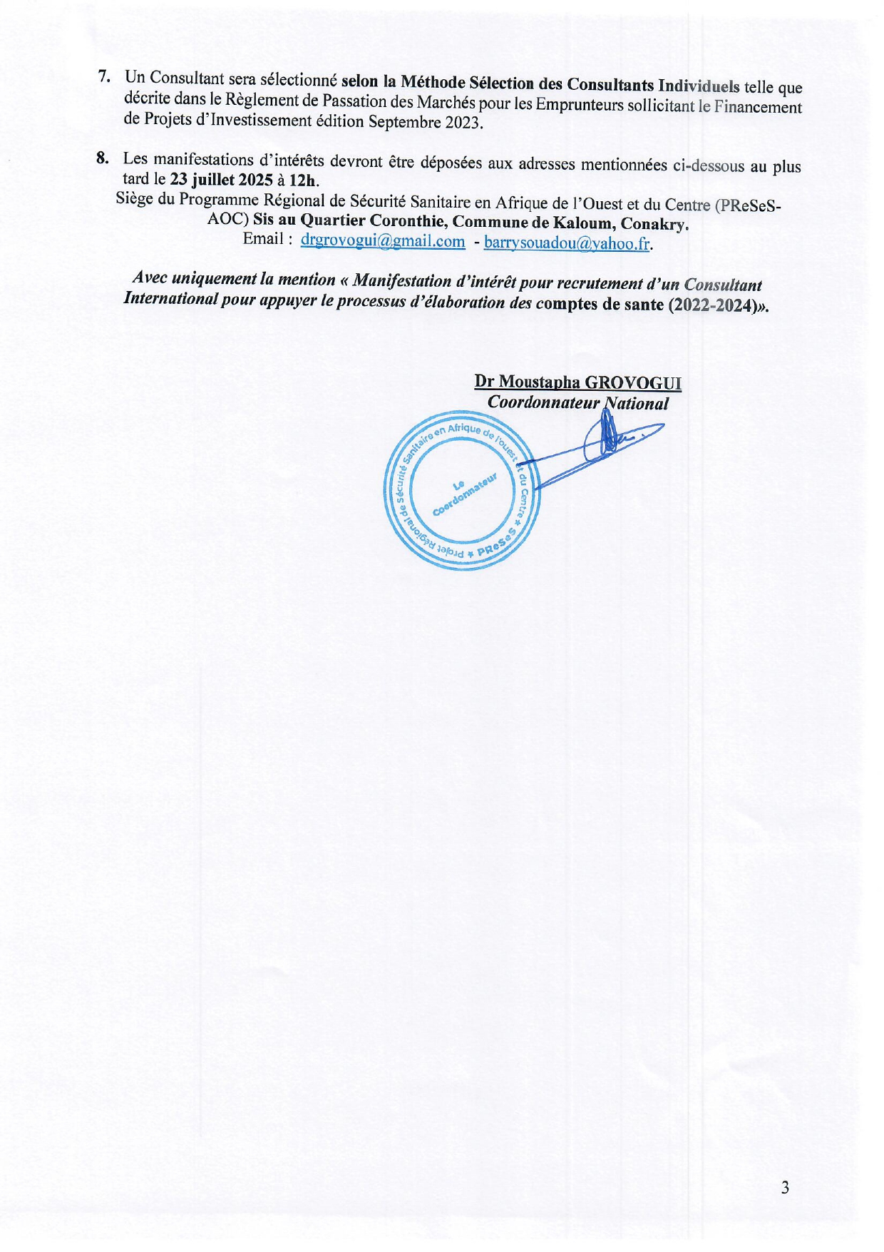 > APPEL A MANIFESTATION D’INTERET POUR LE RECRUTEMENT D’UN CONSULTANT INTERNATIONAL POUR APPUYER LE PROCESSUS D’ELABORATION DES COMPTES DE SANTE (2022-2024)