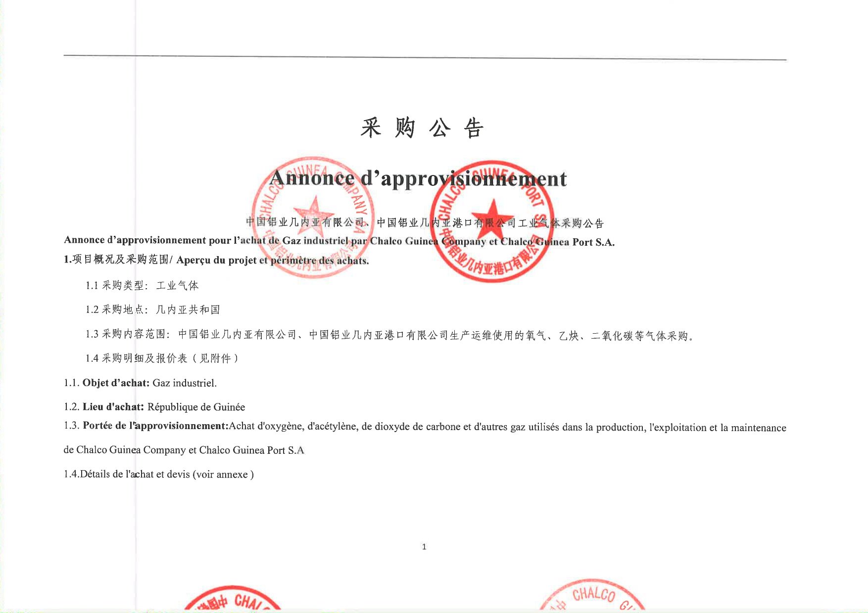 > Annonce d'approvisionnement pour l'achat de Gaz industriel par Chalco Guinea Company et Chalco Guinea Port S.A.