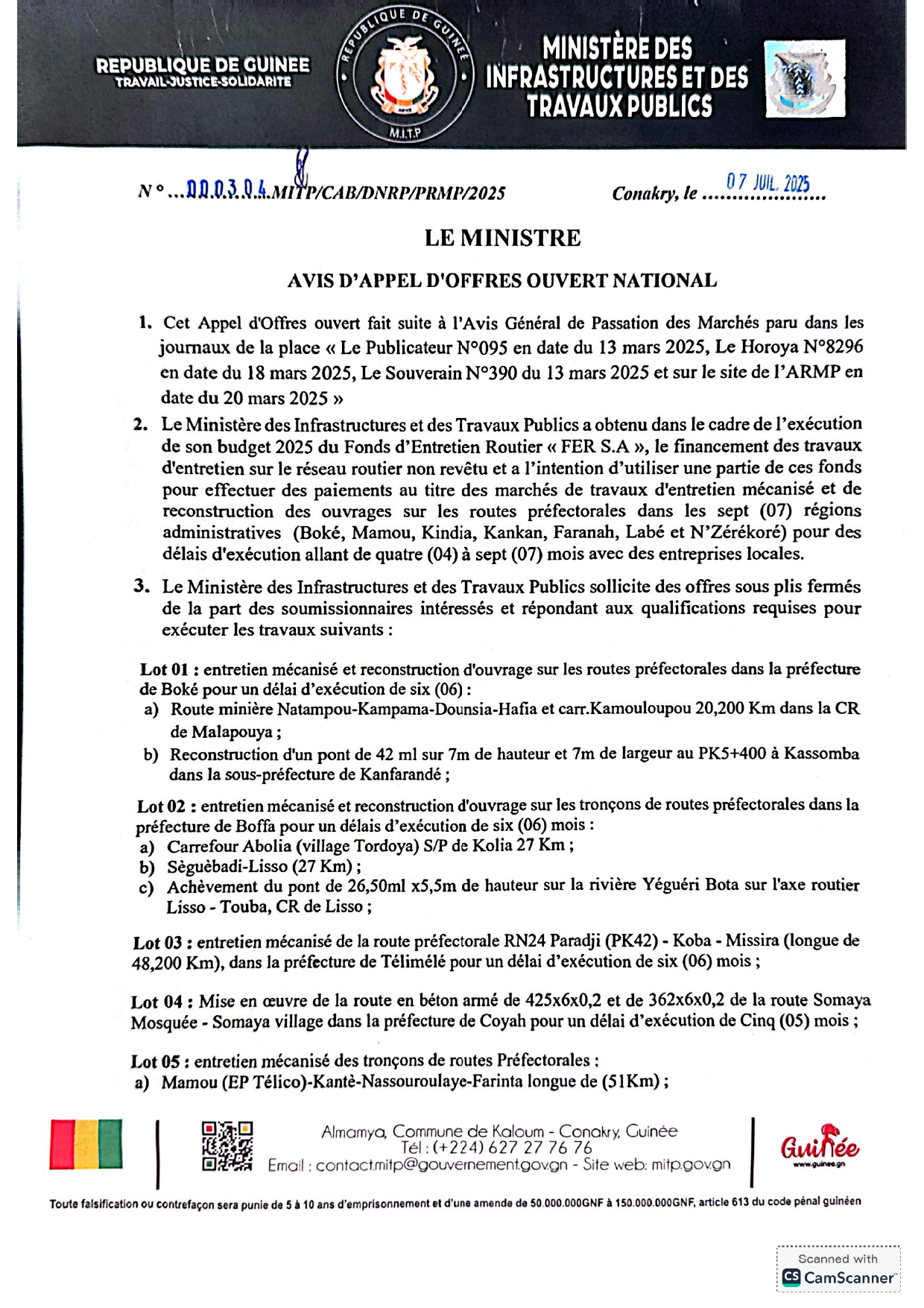 > Avis d'appel d'offres ouvert national pour les marchés de travaux d'entretien mécanisé et de reconstruction des ouvrages sur les routes préfectorales dans les sept (07) régions administratives (Boké, Mamou, Kindia, Kankan, Faranah, Labé et N'Zérékoré)