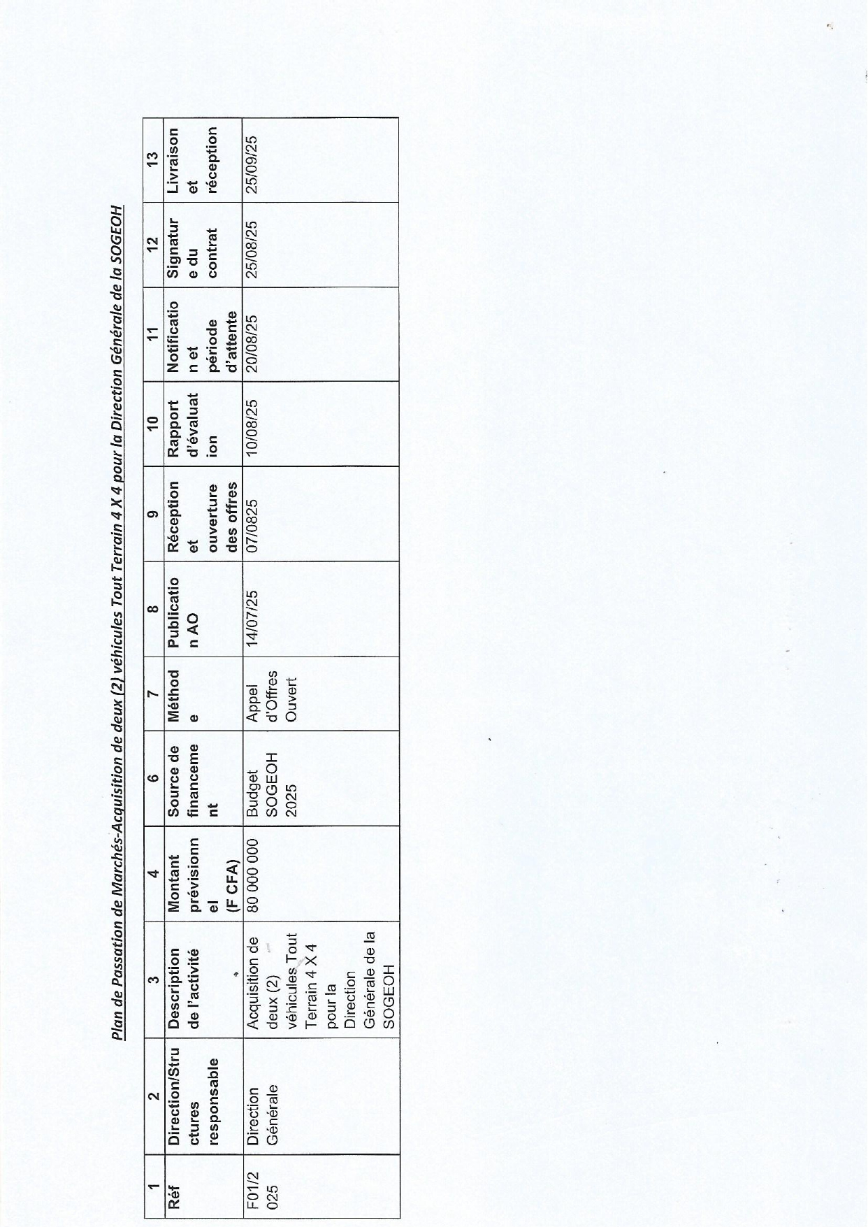 > AVIS D'APPEL D'OFFRES POUR LA FOURNITURE ET LIVRAISON DE DEUX (2) VEHICULES TOUT TERRAIN 4 X 4 A LA DIRECTION GENERALE DE LA SOGEOH