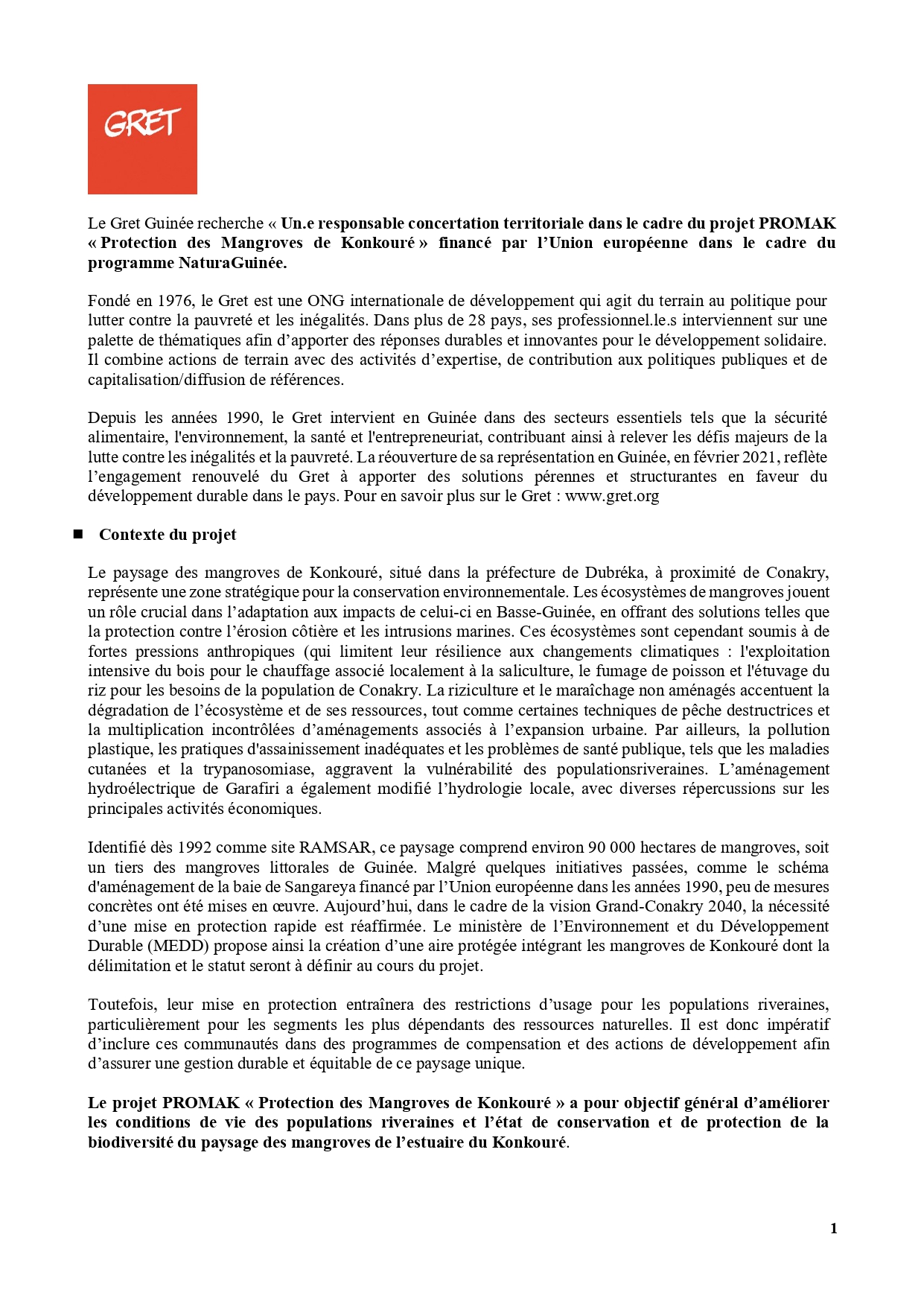 > Avis de recrutement d'« Un.e responsable concertation territoriale dans le cadre du projet PROMAK « Protection des Mangroves de Konkouré » financé par l’Union européenne dans le cadre du programme NaturaGuinée