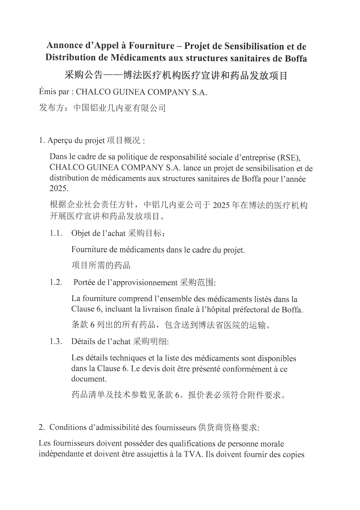 > Annonce d'Appel à Fourniture - Projet de Sensibilisation et de Distribution de Médicaments aux structures sanitaires de Boffa