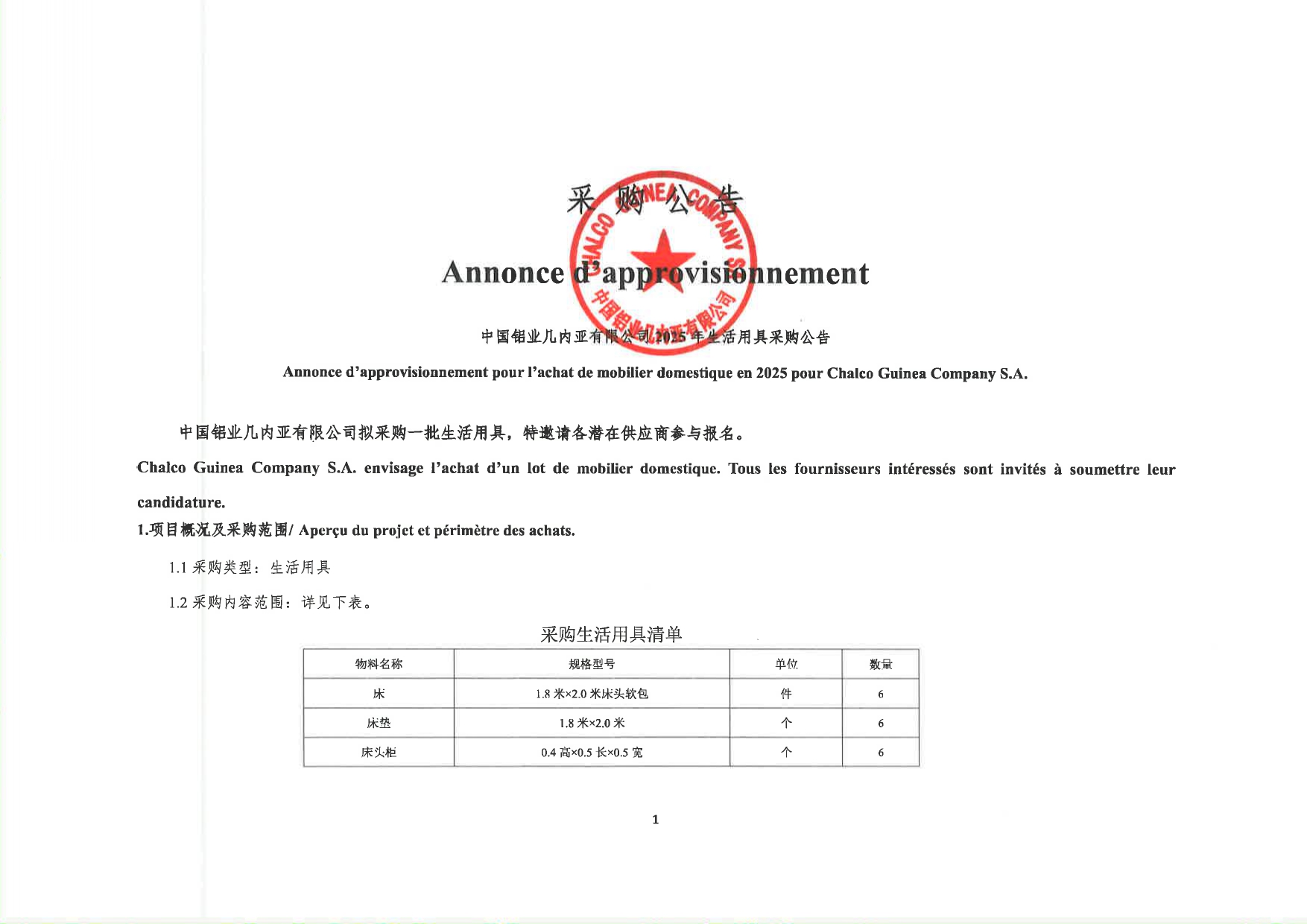 > Annonce d'approvisionnement pour l'achat de mobilier domestique en 2025 pour Chalco Guinea Company S.A.