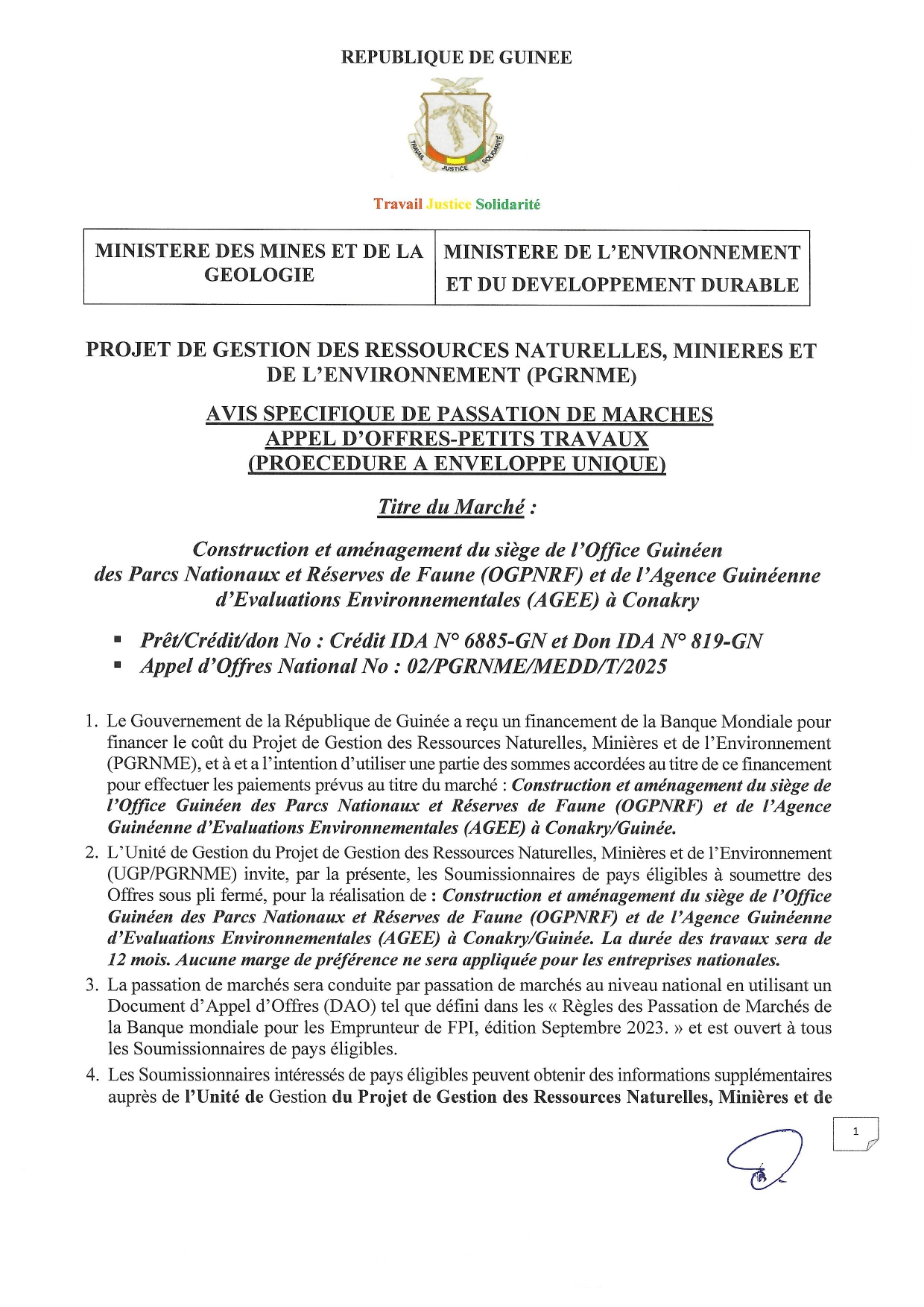 > Avis d'appel d'offres pour la Construction et aménagement du siège de l’Office Guinéen des Parcs Nationaux et Réserves de Faune (OGPNRF) et de l’Agence Guinéenne d’Evaluations Environnementales (AGEE) à Conakry