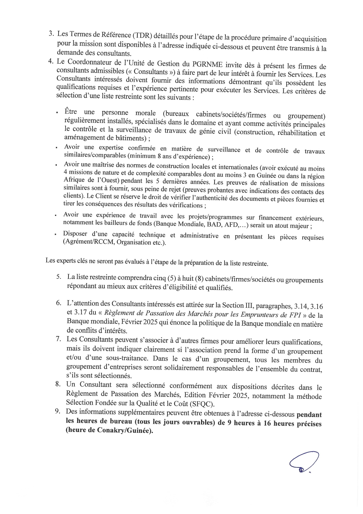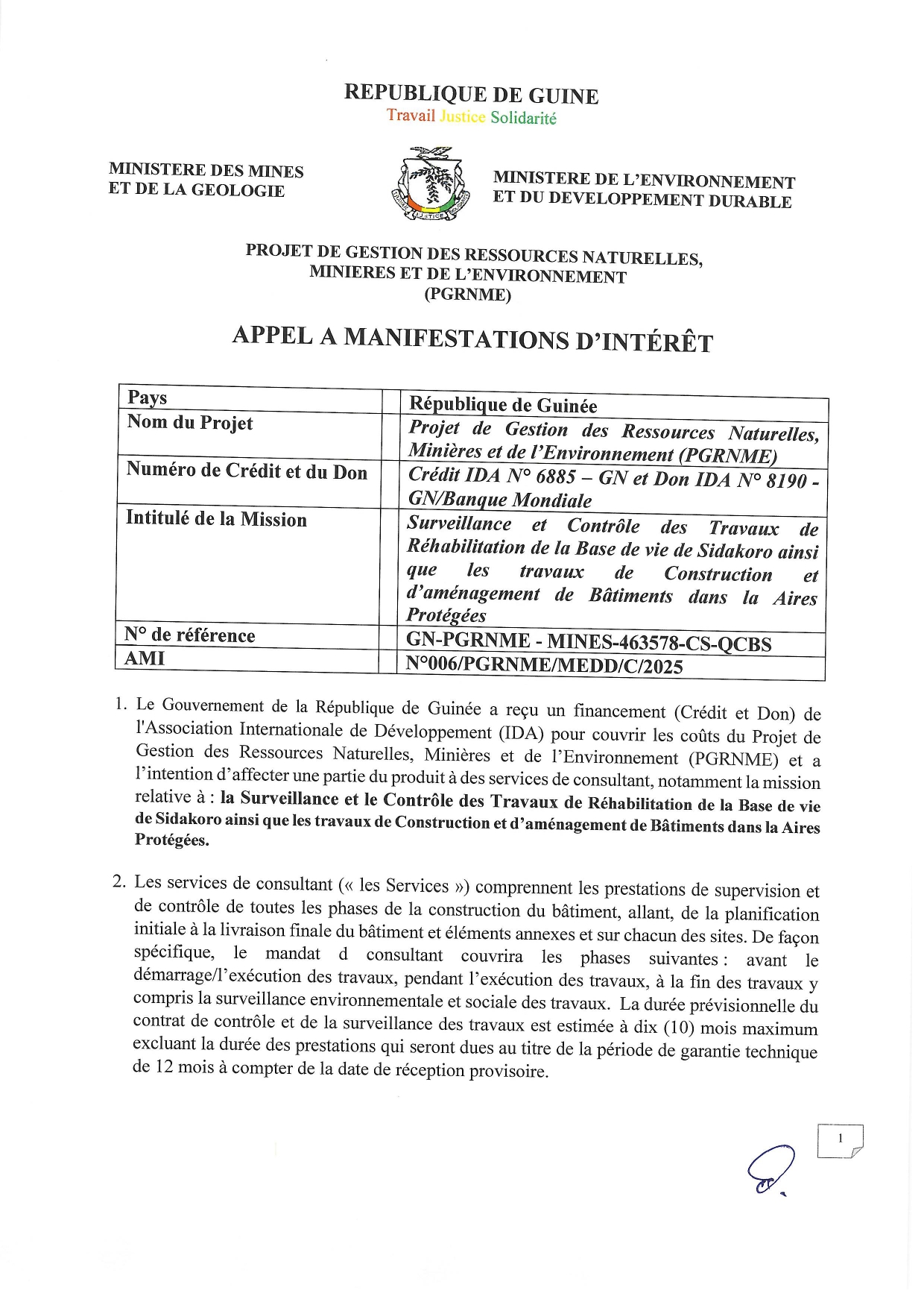 > Avis d'appel d'offres pour la Surveillance et Contrôle des Travaux de Réhabilitation de la Base de vie de Sidakoro ainsi que les travaux de Construction et d’aménagement de Bâtiments dans la Aires Protégées