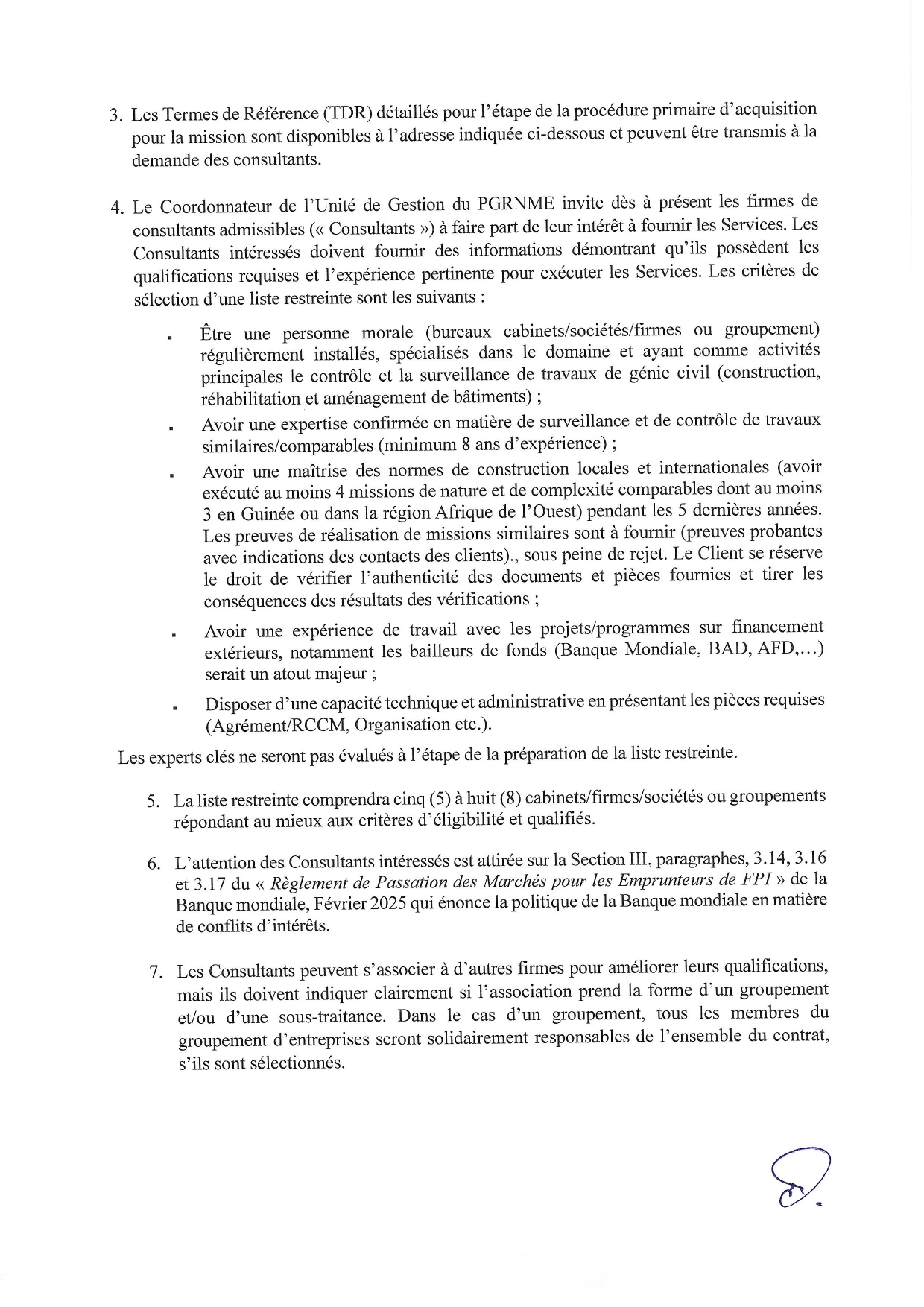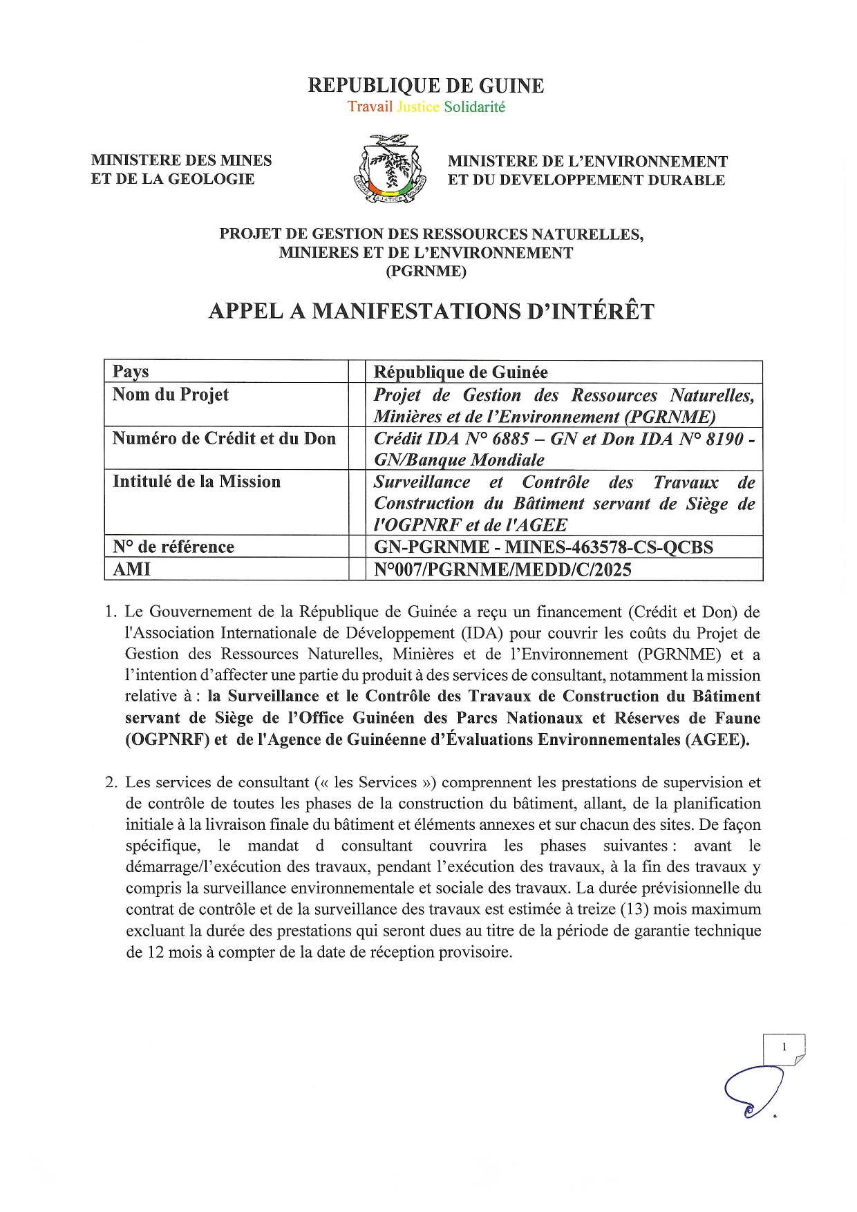 > Avis à manifestation d'intérêt pour la Surveillance et Contrôle des Travaux de Construction du Bâtiment servant de Siège de l'OGPNRF et de l'AGEE