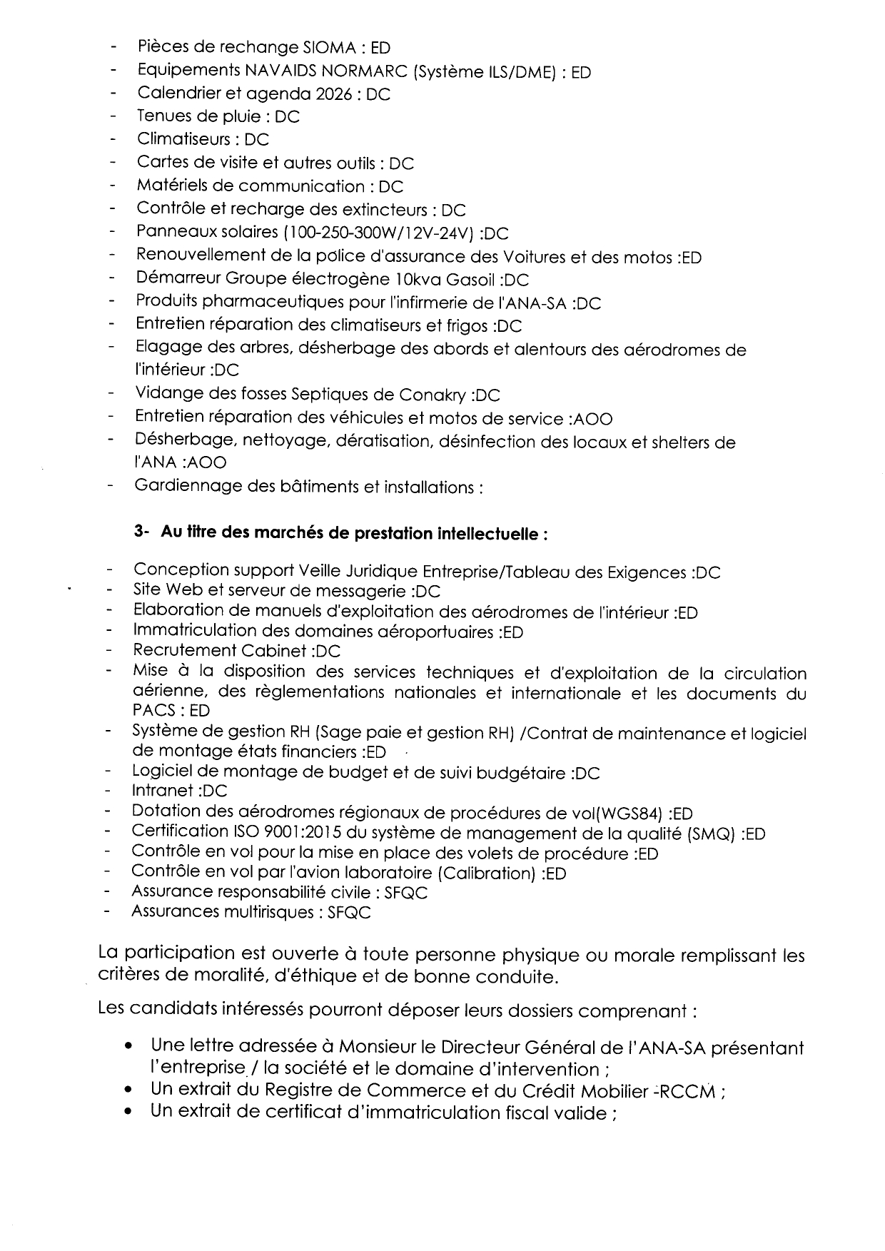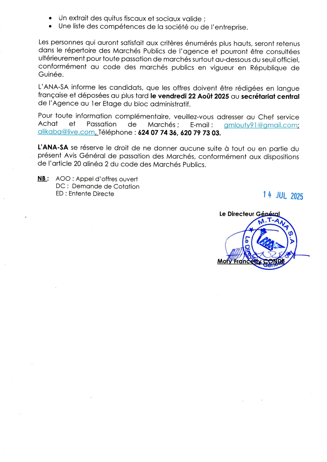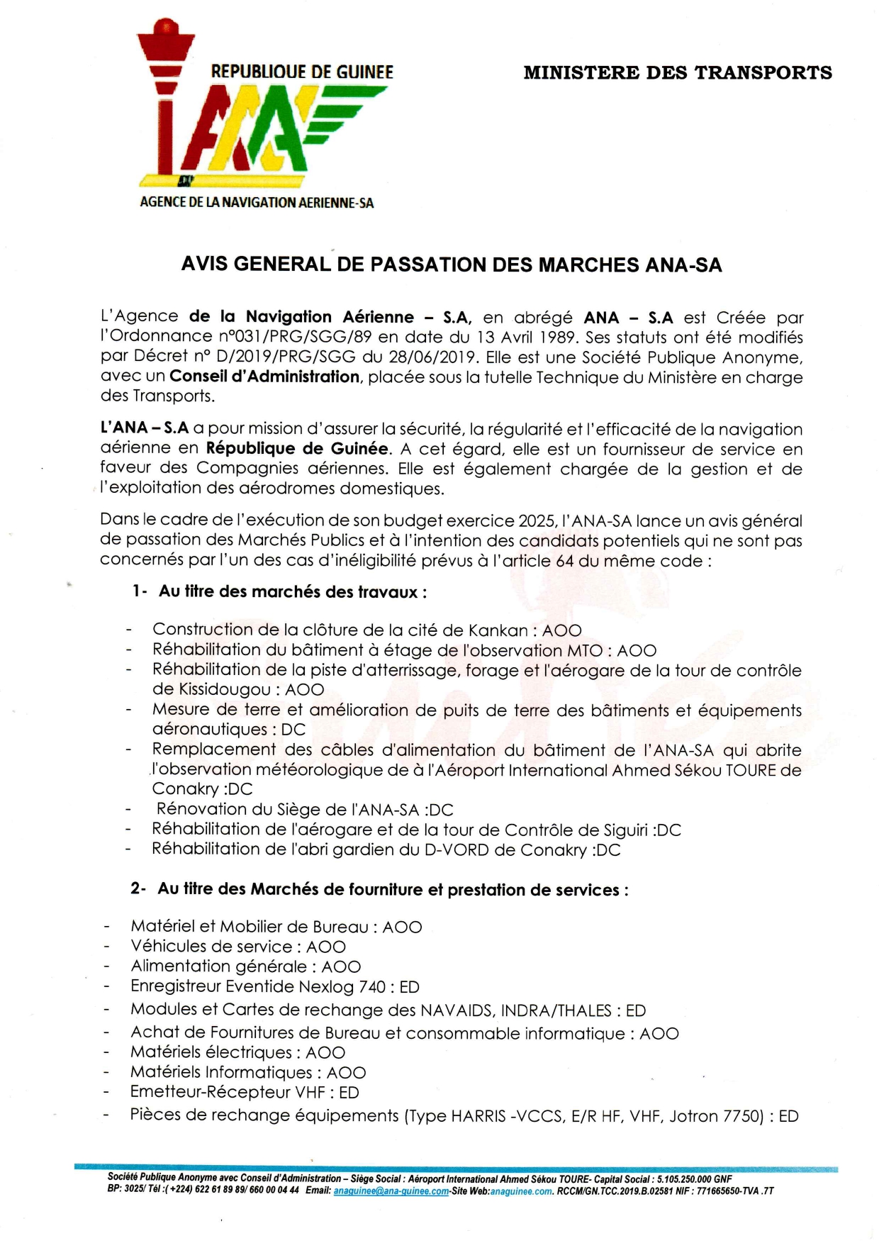 > AVIS GENERAL DE PASSATION DES MARCHES ANA-SA