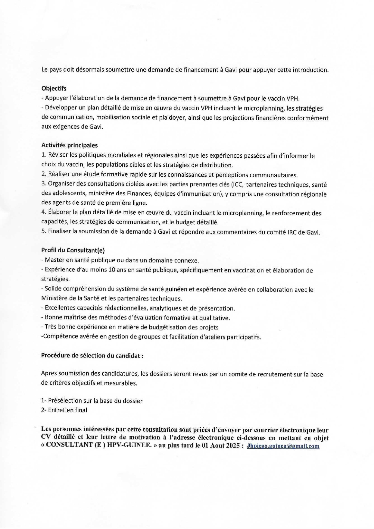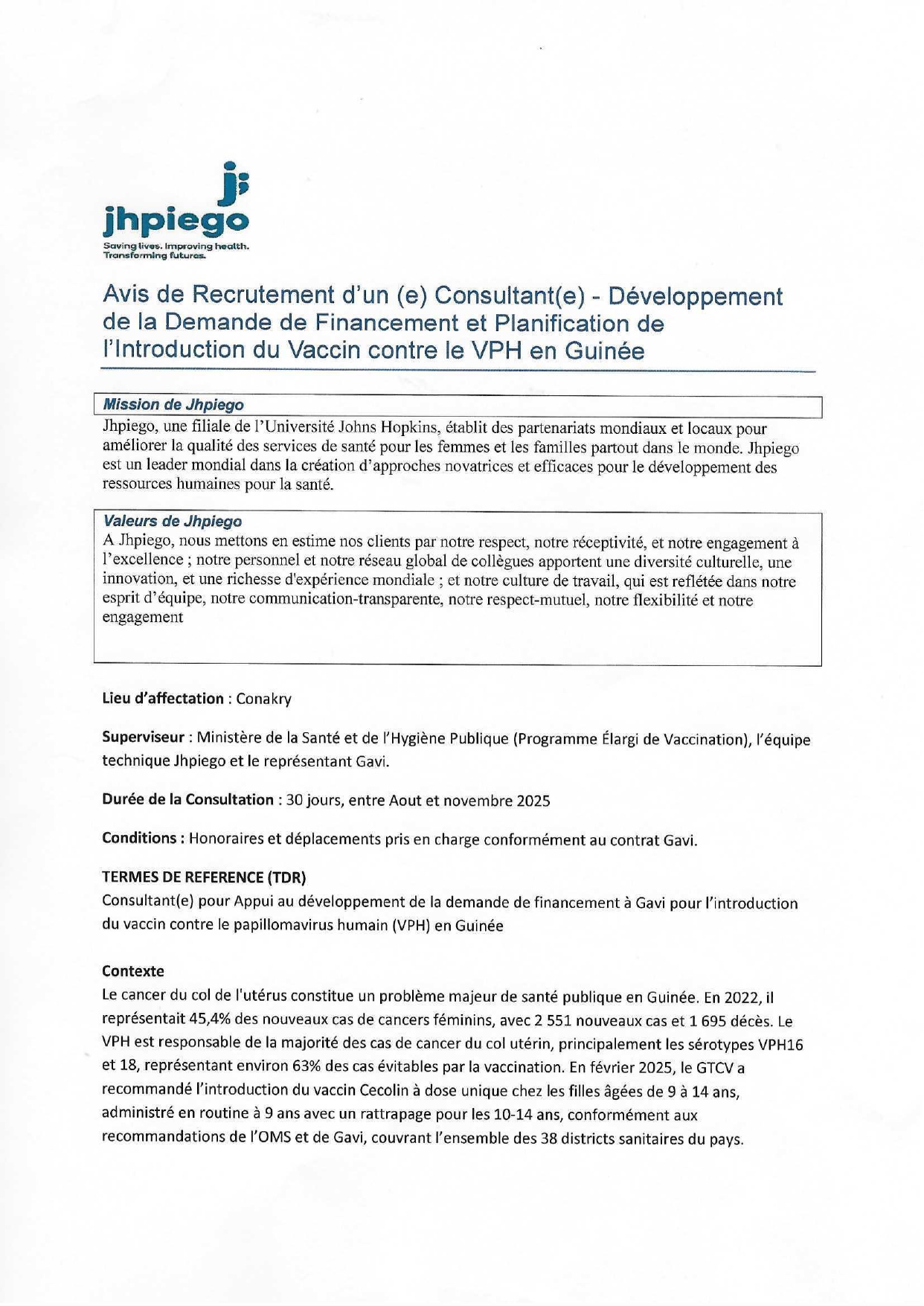 > Avis de Recrutement d’un (e) Consultant(e) - Développement de la Demande de Financement et Planification de l’Introduction du Vaccin contre le VPH en Guinée