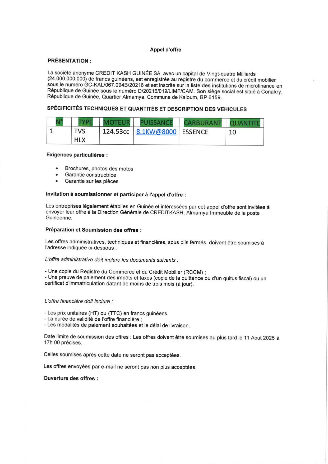 > Avis d'appel d'offres pour l'acquisition de 10 motos