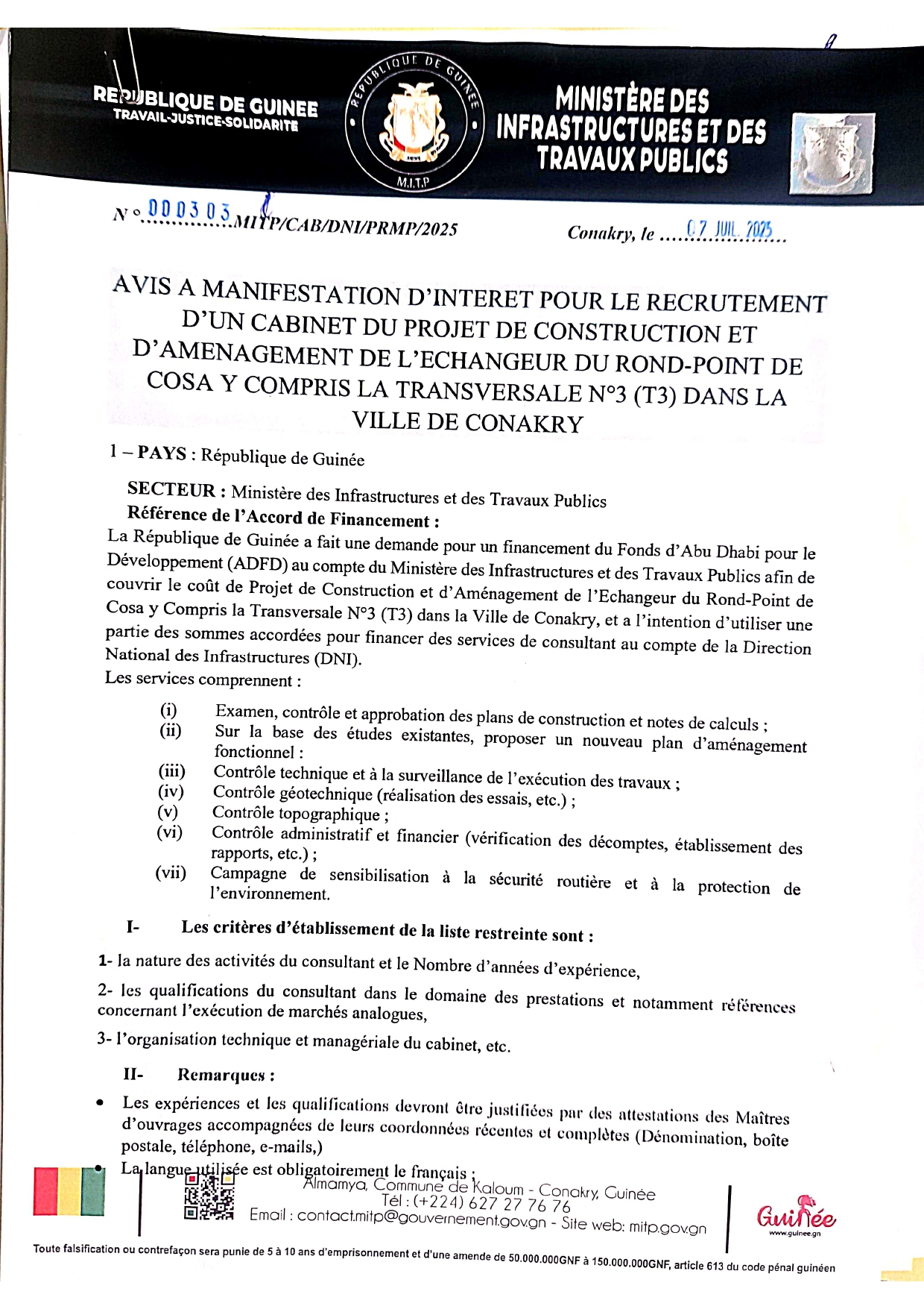 > AVIS A MANIFESTATION D'INTERET POUR LE RECRUTEMENT D'UN CABINET DU PROJET DE CONSTRUCTION ET D'AMENAGEMENT DE L'ECHANGEUR DU ROND-POINT DE COSA Y COMPRIS LA TRANSVERSALE N°3 (T3) DANS LA VILLE DE CONAKRY