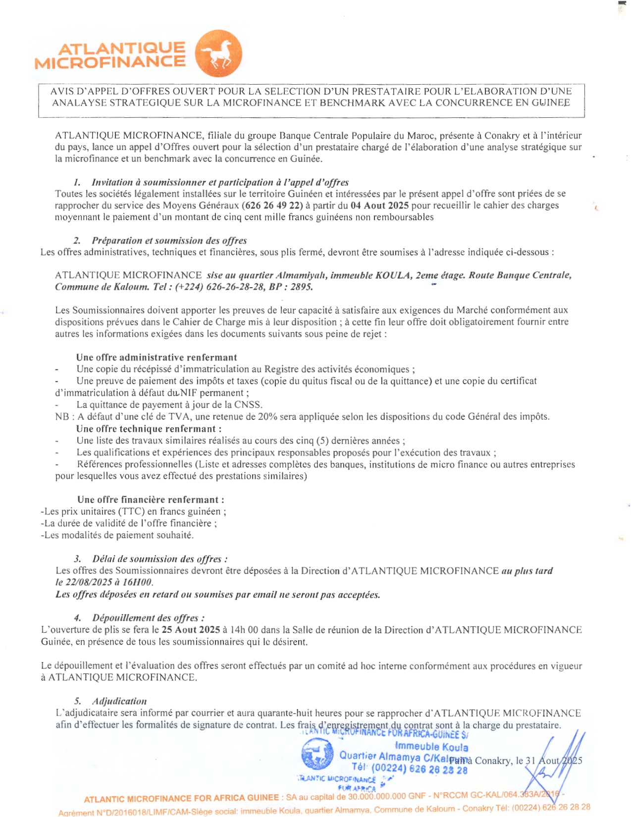 > AVIS D'APPEL D'OFFRES OUVERT POUR LA SELECTION D'UN PRESTATAIRE POUR L'ELABORATION D'UNE ANALAYSE STRATEGIQUE SUR LA MICROFINANCE ET BENCHMARK AVEC LA CONCURRENCE EN GUINEE