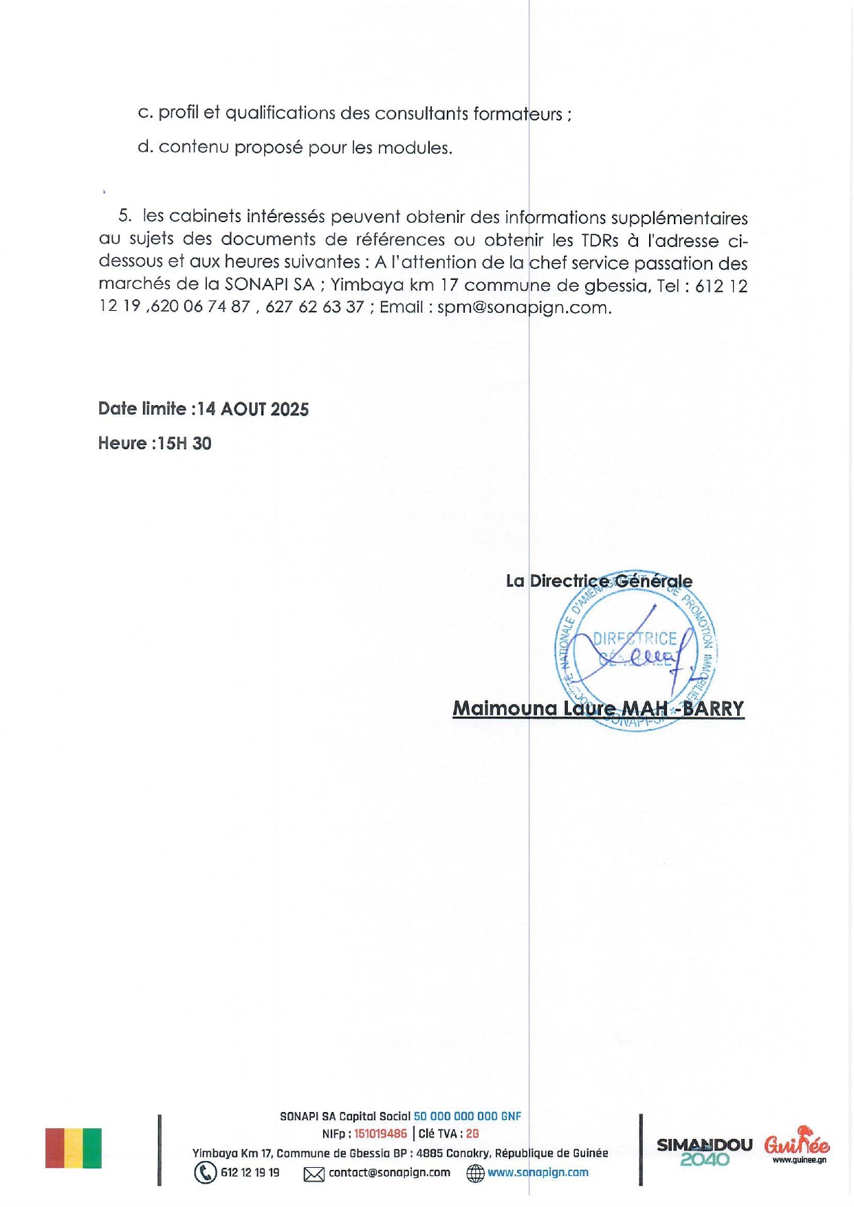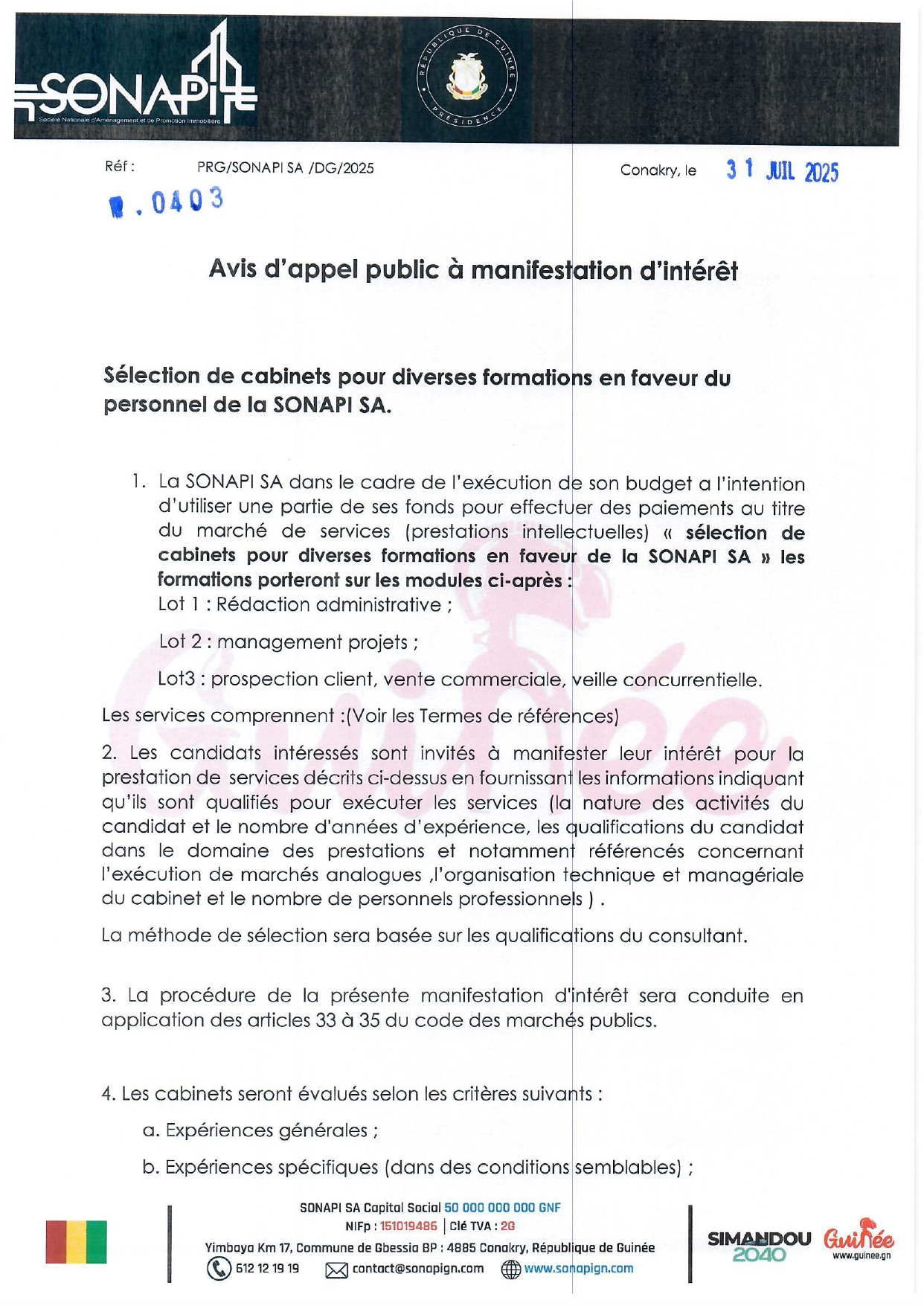 > Avis d’appel public à manifestation d’intérêt pour la Sélection de cabinets pour diverses formations en faveur du personnel de la SONAPI SA