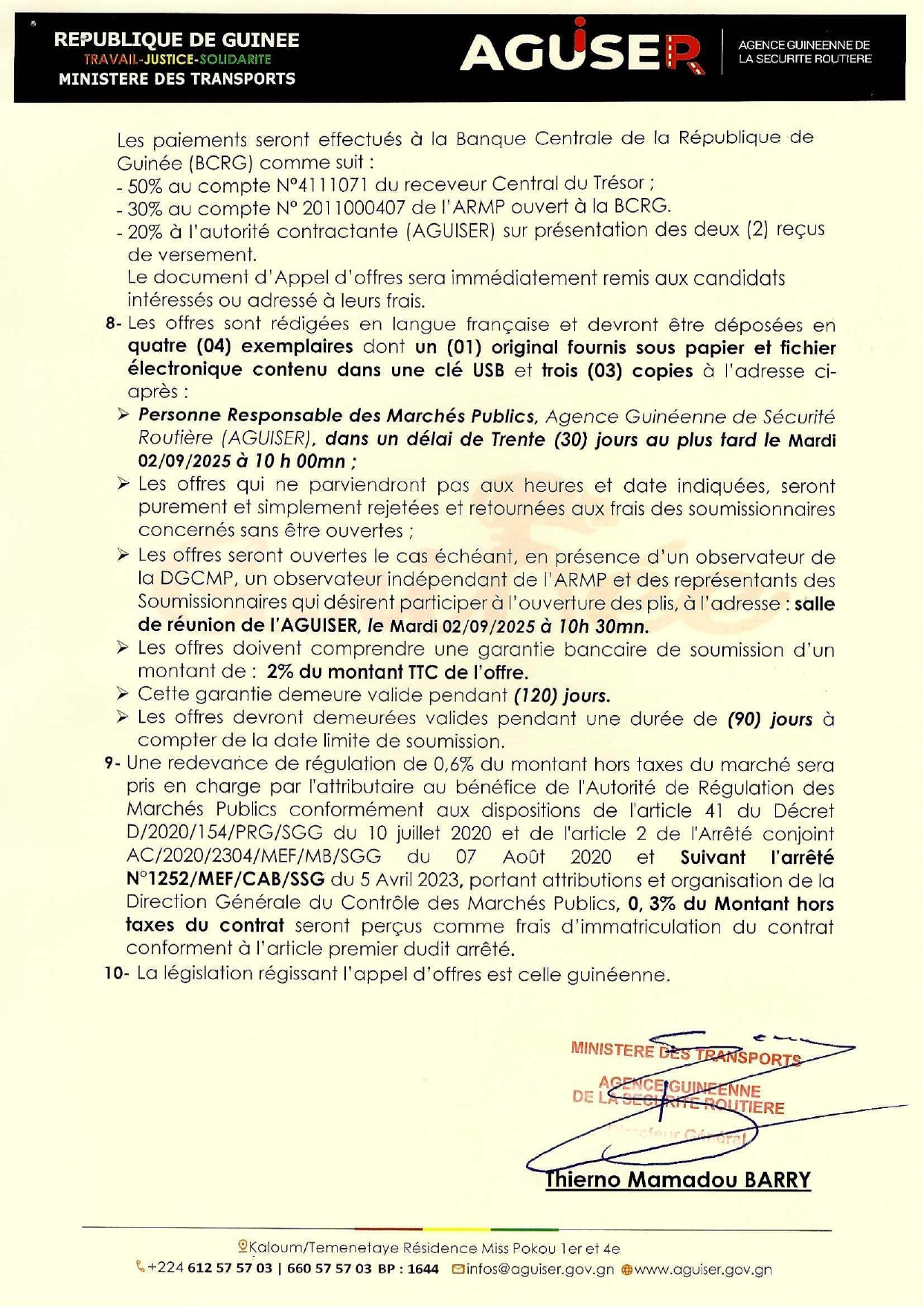 > Avis d'appel d'offres pour le marché de l'Organisation de la 4ème Edition de la Semaine Nationale de la Sécurité Routière (SENASER-2025)