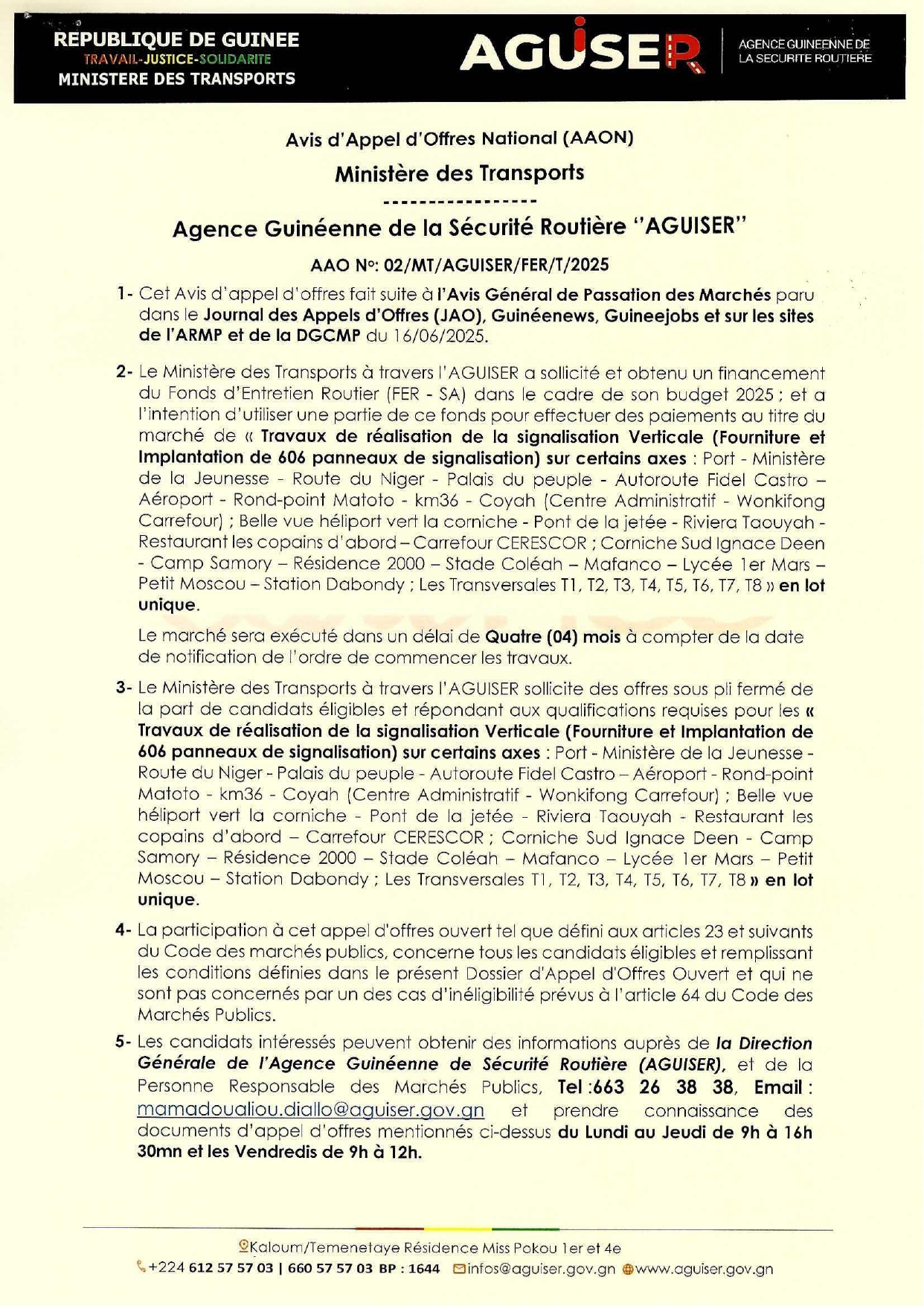 > Marché de « Travaux de réalisation de la signalisation Verticale (Fourniture et Implantation de 606 panneaux de signalisation) sur certains axes : Port - Ministère de la Jeunesse - Route du Niger - Palais du peuple - Autoroute ...