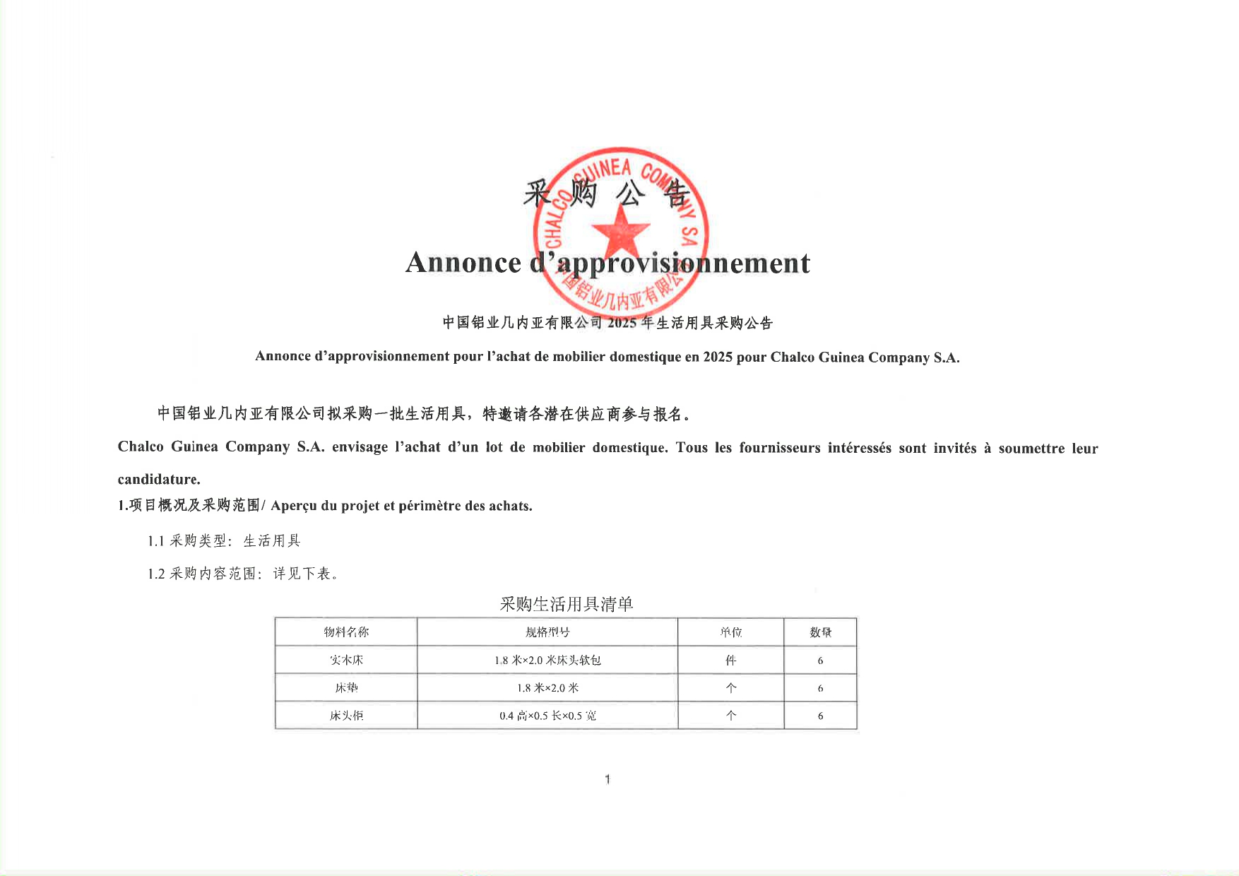 > Annonce d'approvisionnement d'approvisionnement pour l'achat de mobilier domestique en 2025 pour Chalco Guinea Company S.A.