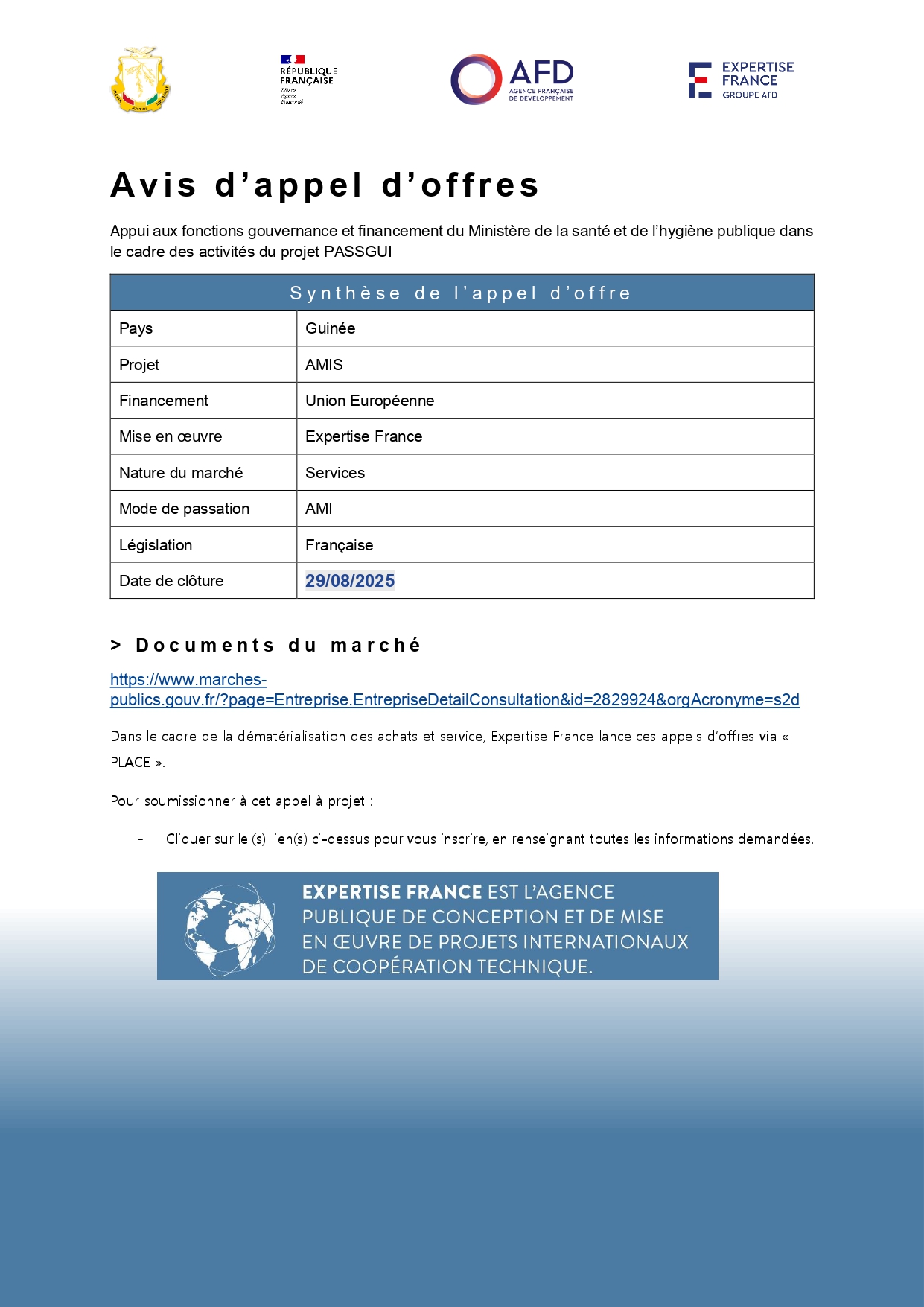 > Avis d’appel d’offres pour l'Appui aux fonctions gouvernance et financement du Ministère de la santé et de l’hygiène publique dans le cadre des activités du projet PASSGUI