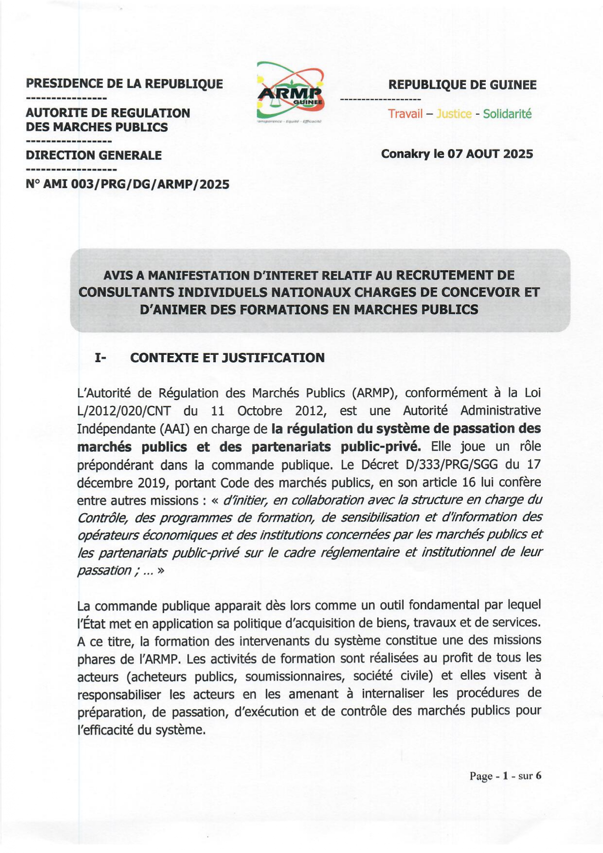 > AVIS A MANIFESTATION D'INTERET RELATIF AU RECRUTEMENT DE CONSULTANTS INDIVIDUELS NATIONAUX CHARGES DE CONCEVOIR ET D'ANIMER DES FORMATIONS EN MARCHES PUBLICS