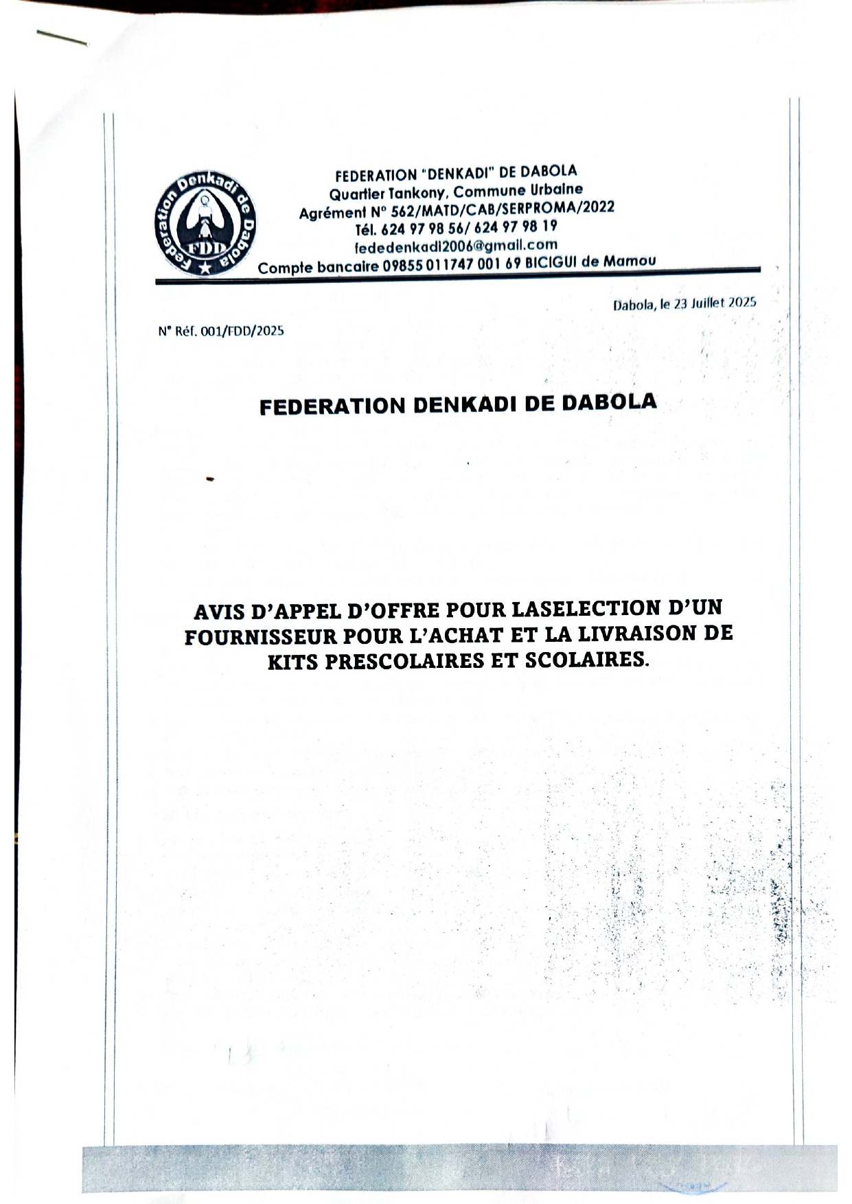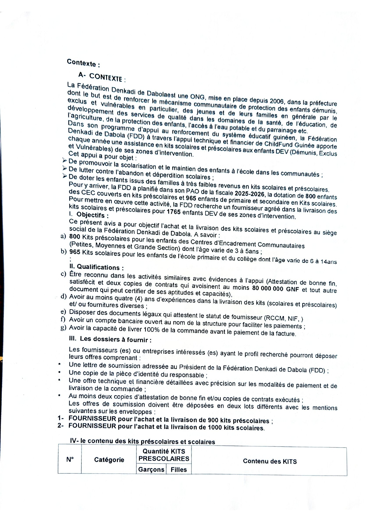 > AVIS D'APPEL D'OFFRE POUR LA SELECTION D'UN FOURNISSEUR POUR L'ACHAT ET LA LIVRAISON DE KITS PRESCOLAIRES ET SCOLAIRES