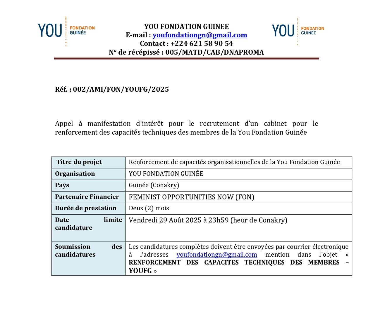 > Appel à manifestation d’intérêt pour le recrutement d’un cabinet pour le renforcement des capacités techniques des membres de la You Fondation Guinée