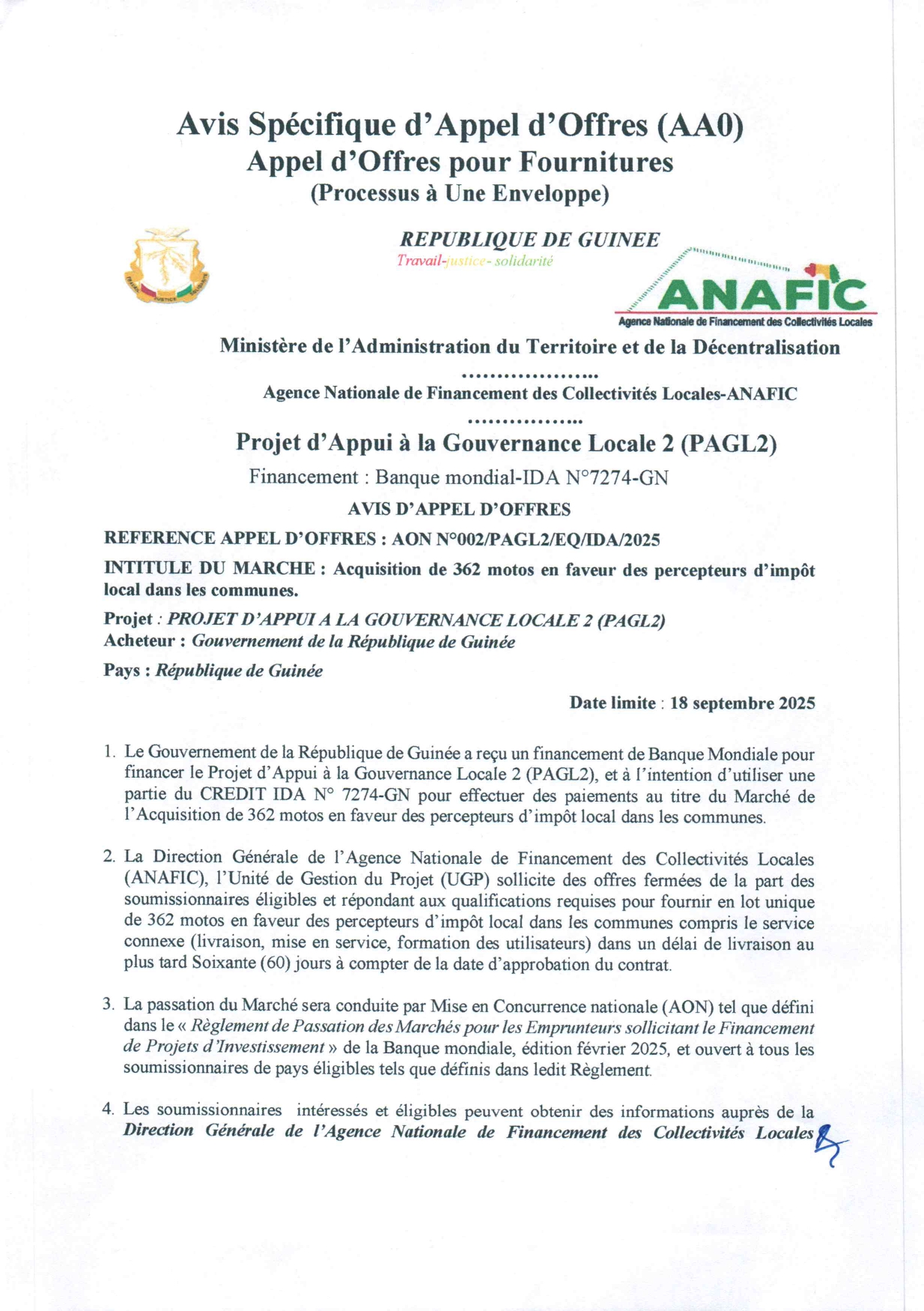 > Avis d'appel d'offres pour l'Acquisition de 362 motos en faveur des percepteurs d’impôt local dans les communes.