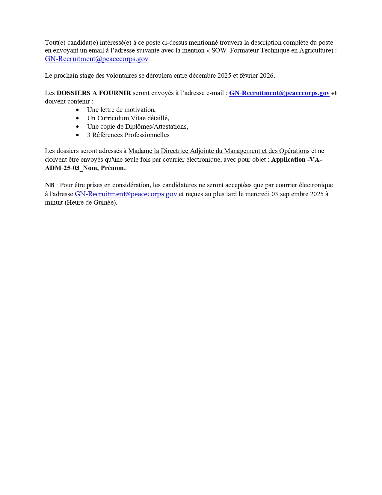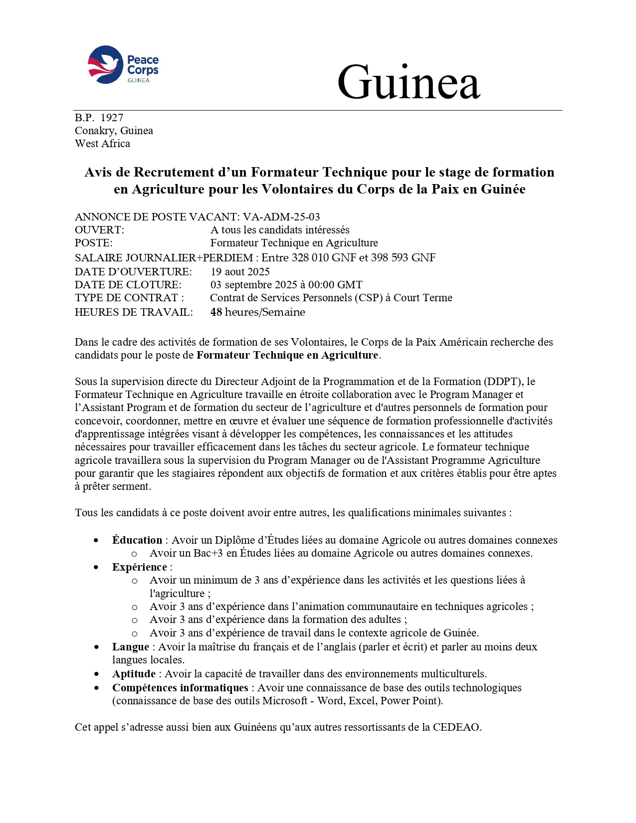 > Avis de Recrutement d’un Formateur Technique pour le stage de formation en Agriculture pour les Volontaires du Corps de la Paix en Guinée
