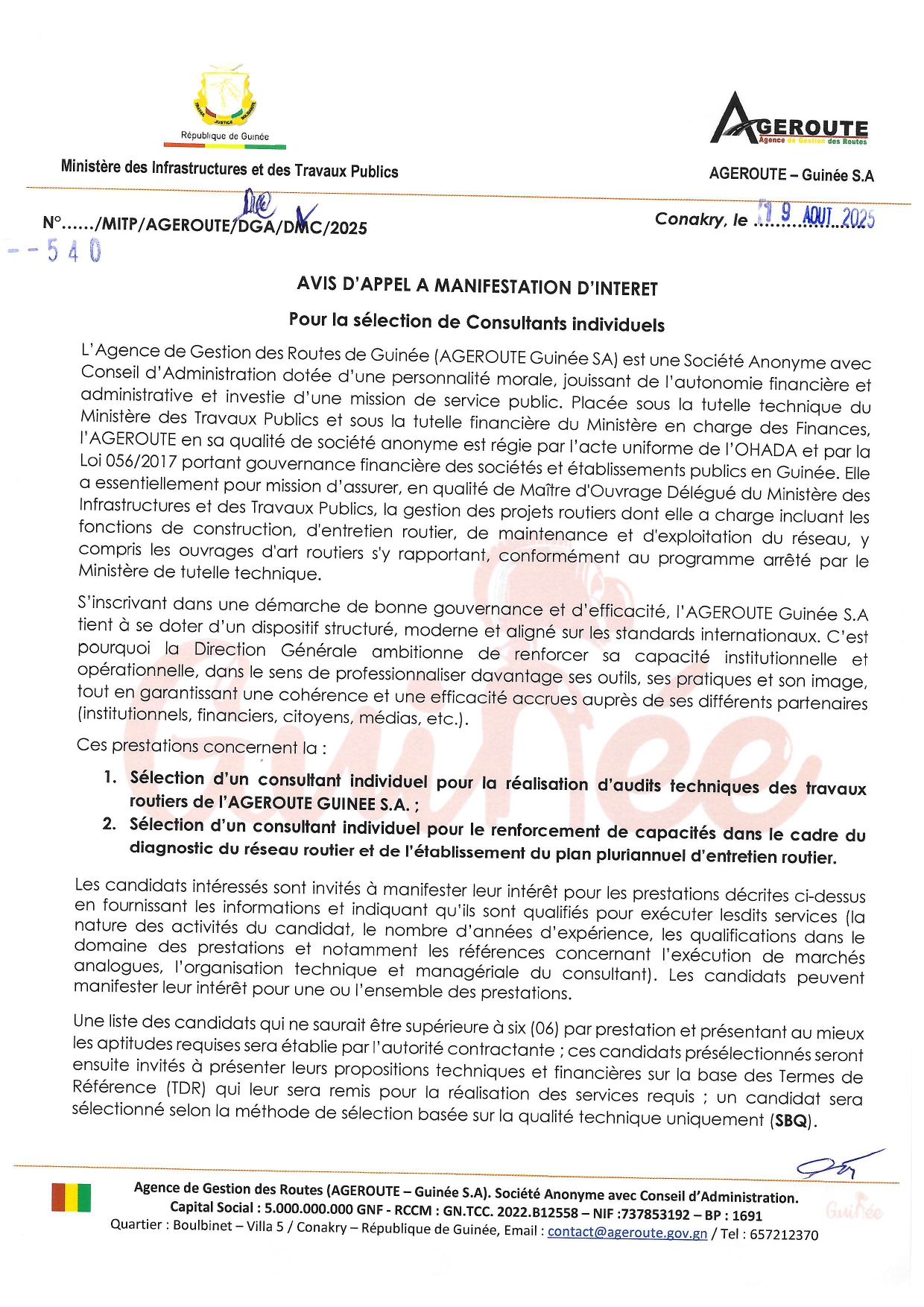 > Avis à manifestation d'intérêt pour la Sélection d'un consultant individuel pour la réalisation d'audits techniques des travaux routiers de l'AGEROUTE GUINEE S.A. et la Sélection d'un consultant individuel pour le renforcement de capacités...