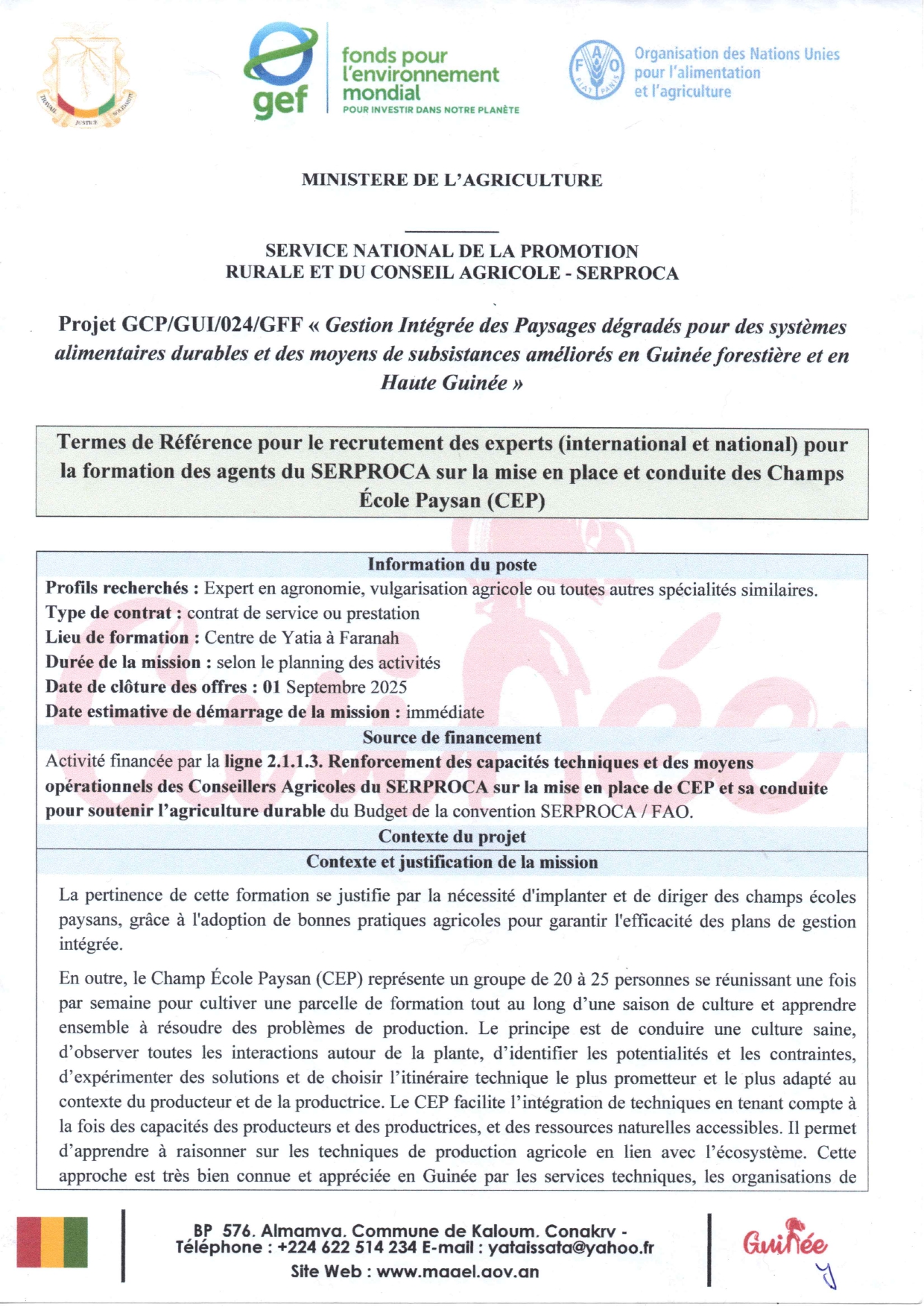 > Termes de Référence pour le recrutement des experts (international et national) pour la formation des agents du SERPROCA sur la mise en place et conduite des Champs École Paysan (CEP)
