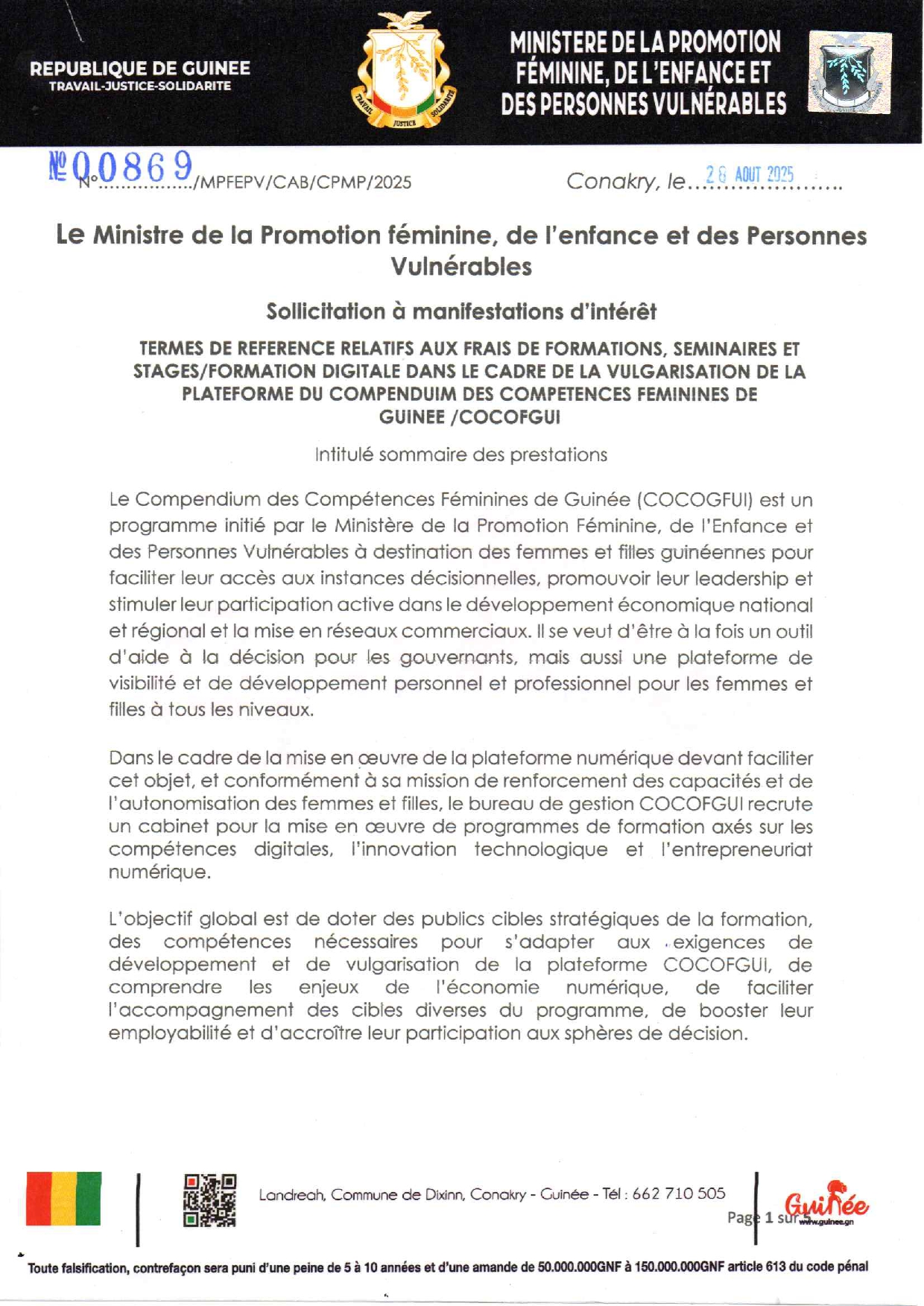 > TERMES DE REFERENCE RELATIFS AUX FRAIS DE FORMATIONS, SEMINAIRES ET STAGES/FORMATION DIGITALE DANS LE CADRE DE LA VULGARISATION DE LA PLATEFORME DU COMPENDUIM DES COMPETENCES FEMININES DE GUINEE /COCOFGUI
