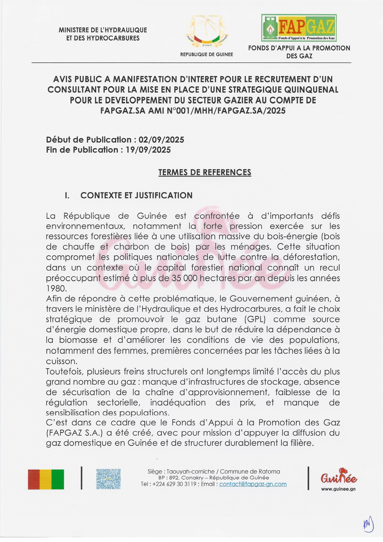 > AVIS PUBLIC A MANIFESTATION D'INTERET POUR LE RECRUTEMENT D'UN CONSULTANT POUR LA MISE EN PLACE D'UNE STRATEGIQUE QUINQUENAL POUR LE DEVELOPPEMENT DU SECTEUR GAZIER AU COMPTE DE FAPGAZ.SA
