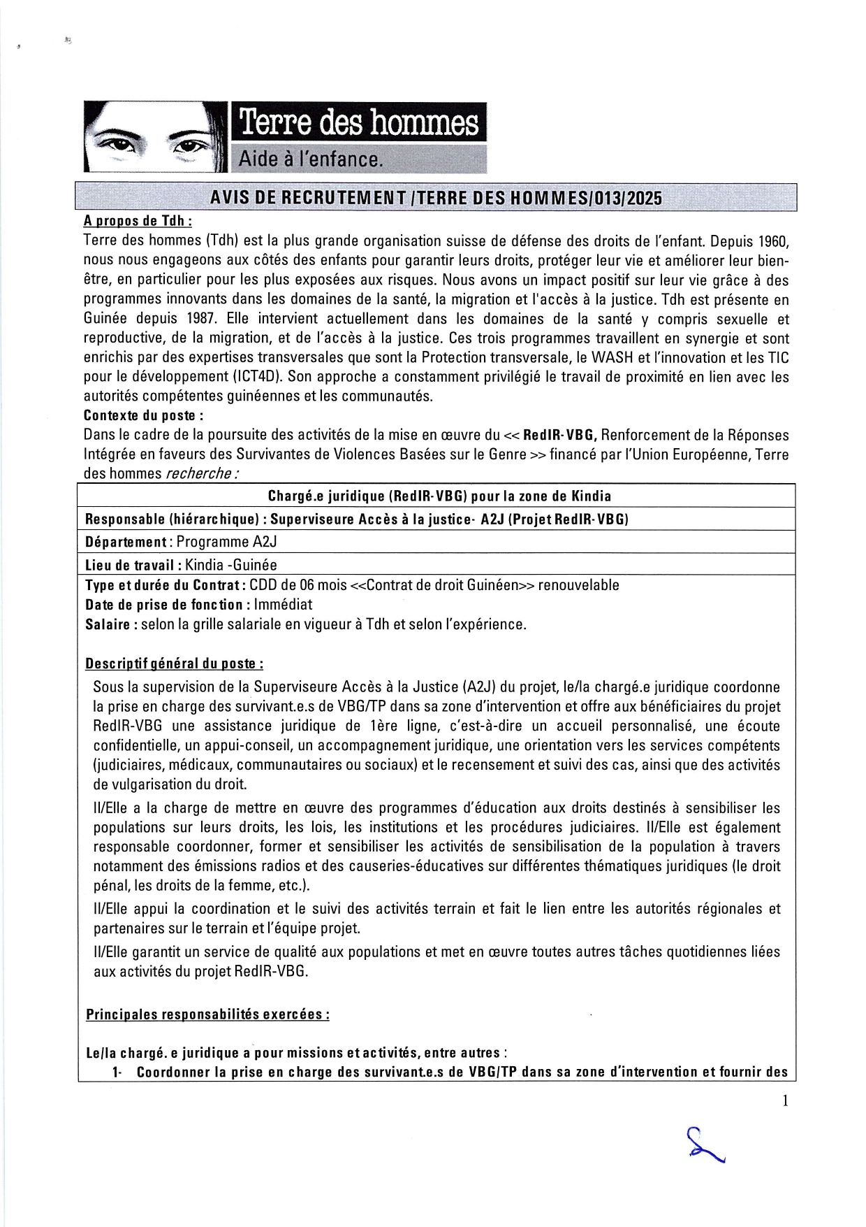 > Avis de recrutement d'un.e Chargé.e juridique (RedIR-VBG) pour la zone de Kindia