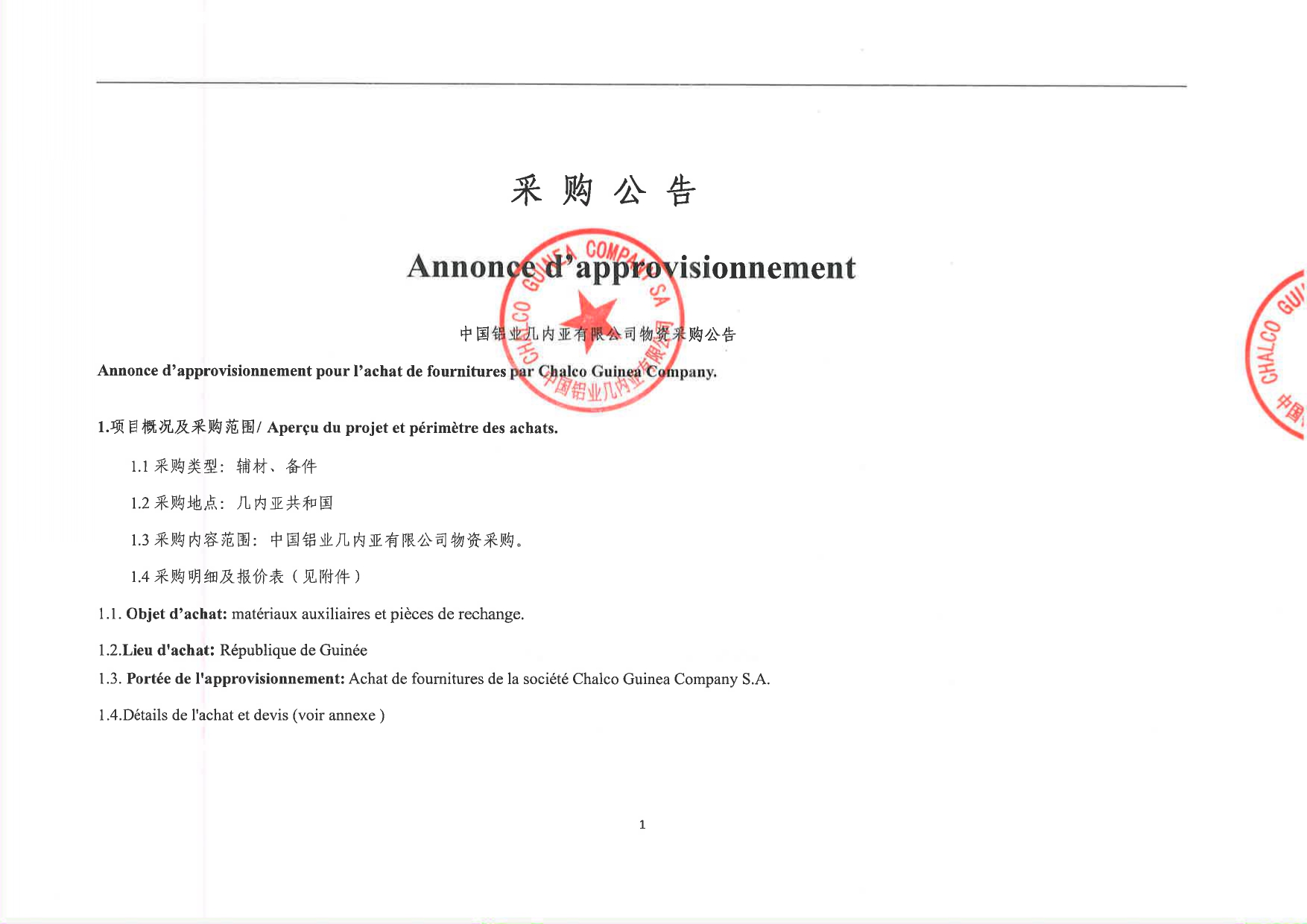 > Annonce d'approvisionnement pour l'achat de fournitures de materiaux auxiliaires et pieces de rechange
