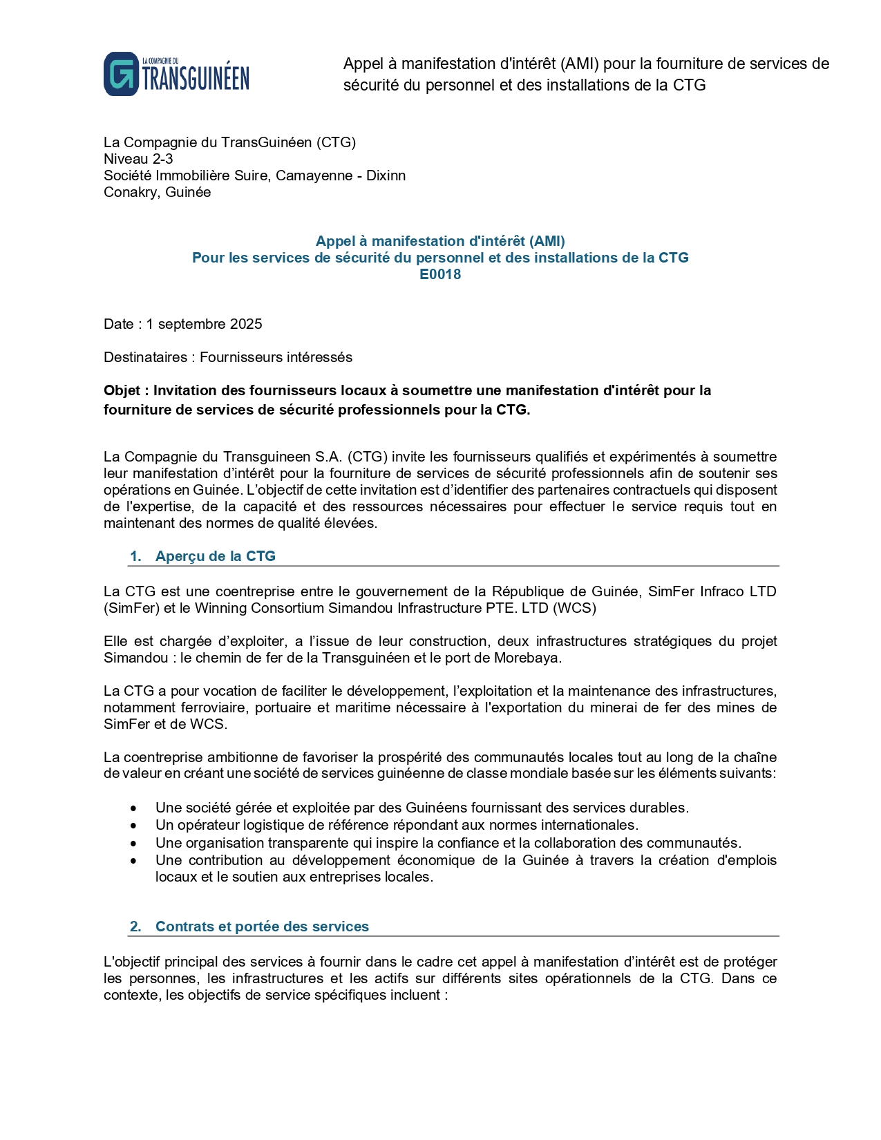 > Appel à manifestation d'intérêt (AMI) Pour les services de sécurité du personnel et des installations de la CTG E0018