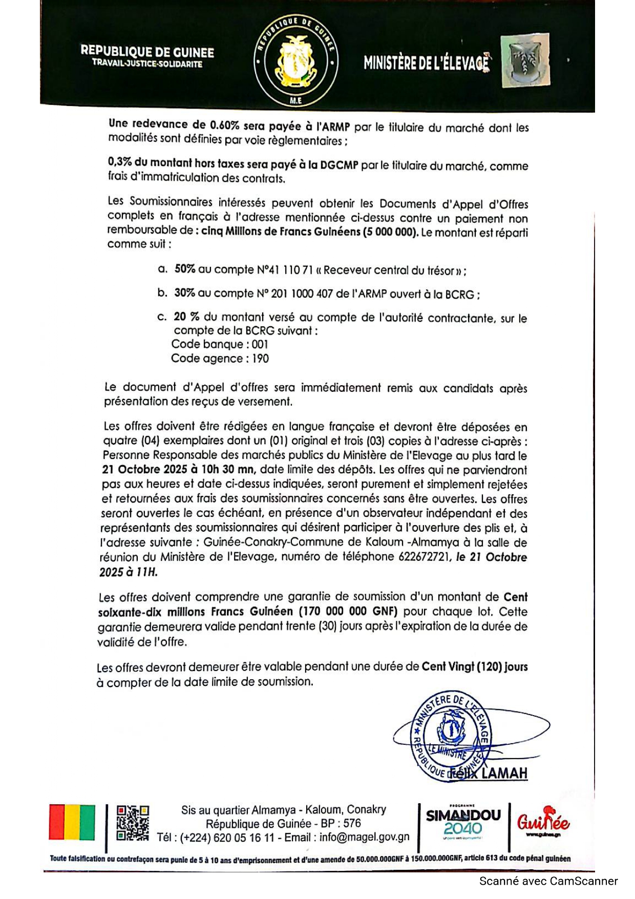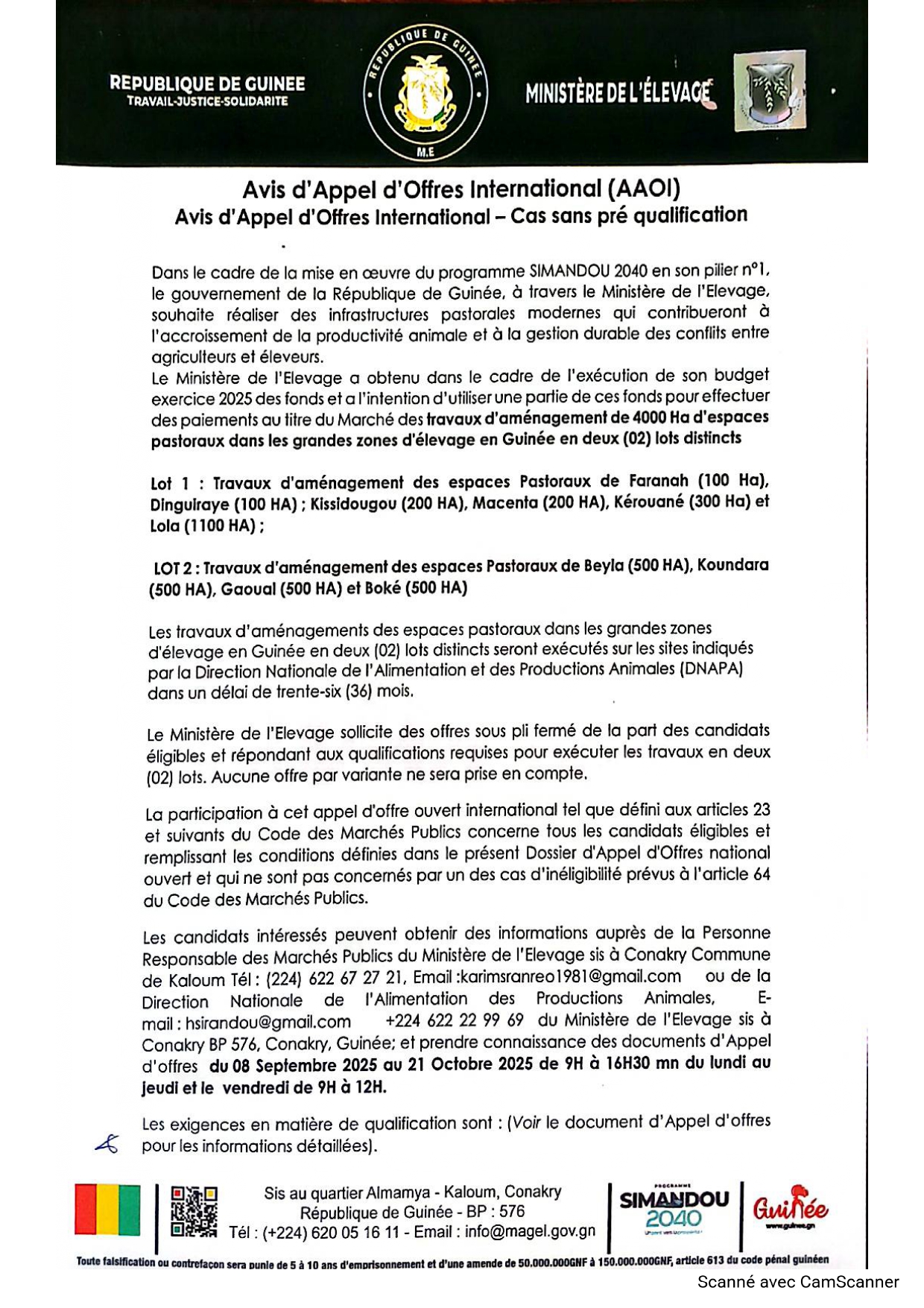 > Avis d'appel d'offres pour le Marché des travaux d'aménagement de 4000 Ha d'espaces pastoraux dans les grandes zones d'élevage en Guinée en deux (02) lots distincts