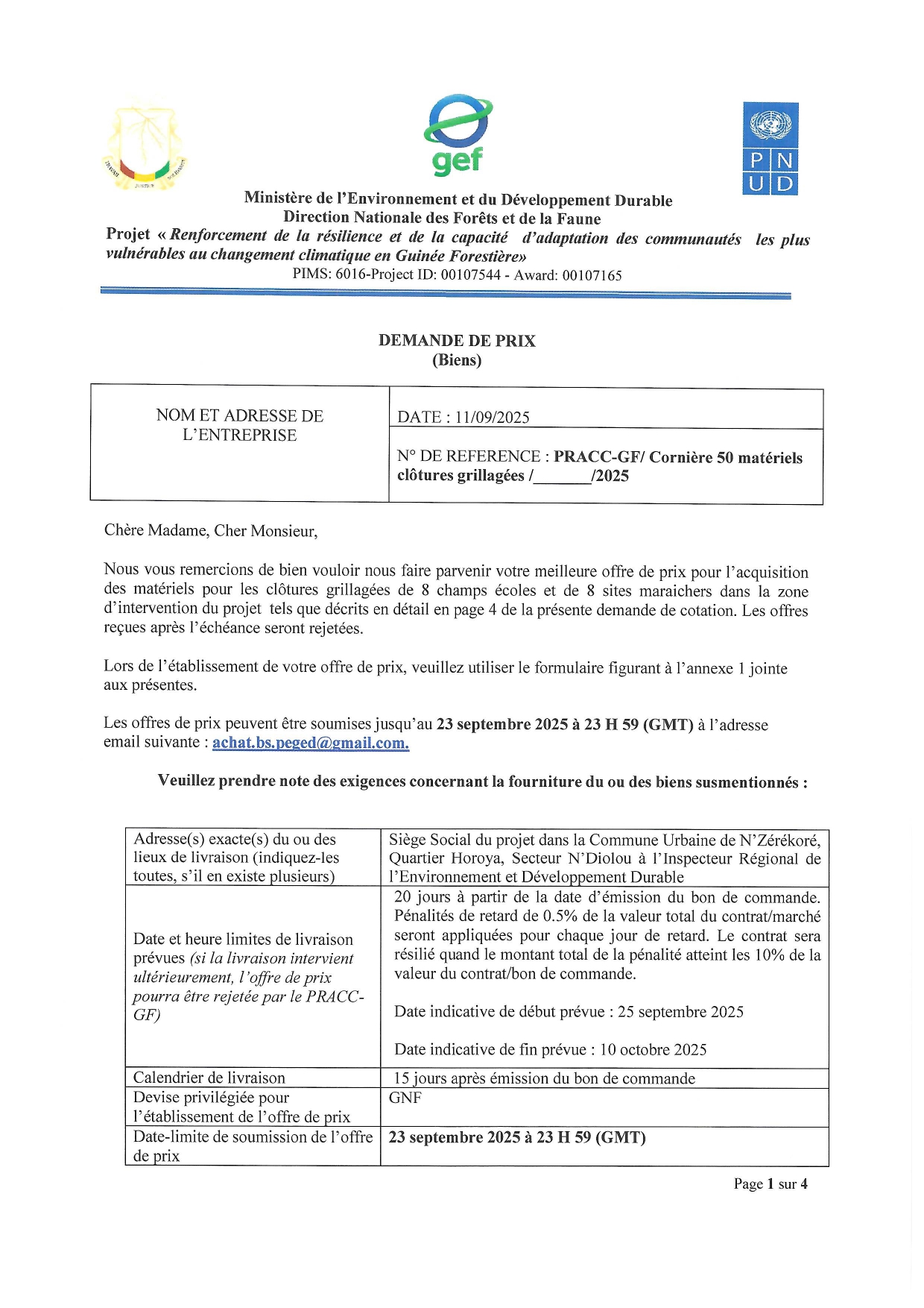 > Avis d'appel d'offres pour l'acquisition des matériels pour les clôtures grillagées de 8 champs écoles et de 8 sites maraichers dans la zone d'intervention du projet