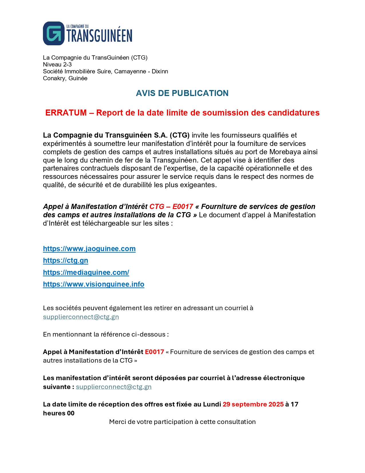 > ERRATUM – Report de la date limite de soumission des candidatures : Fourniture de services de gestion des camps et autres installations de la CTG