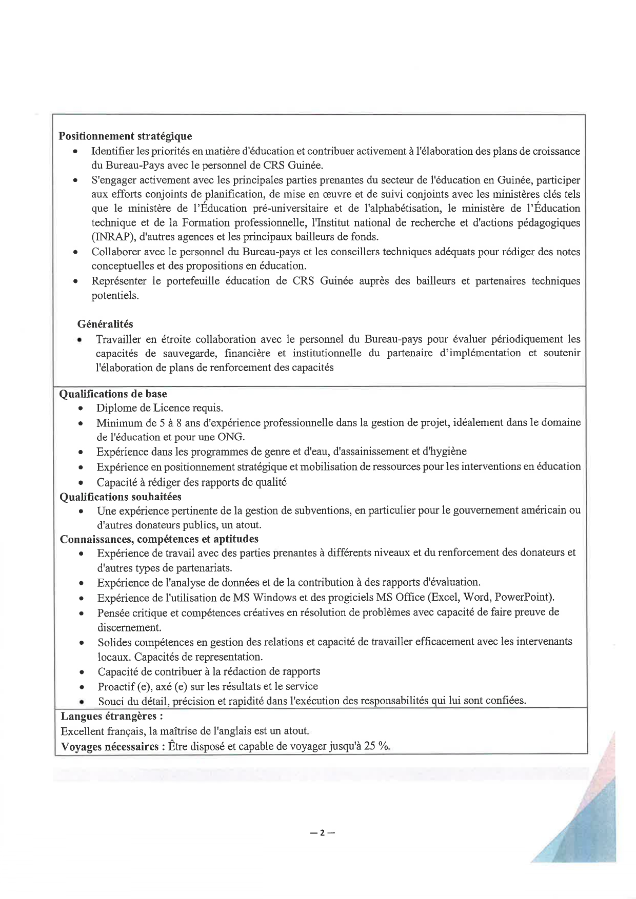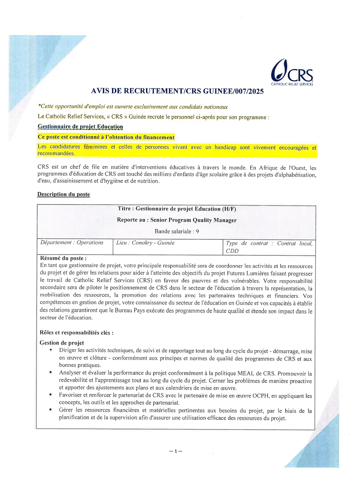 > Avis de recrutement d'un Gestionnaire de projet Education