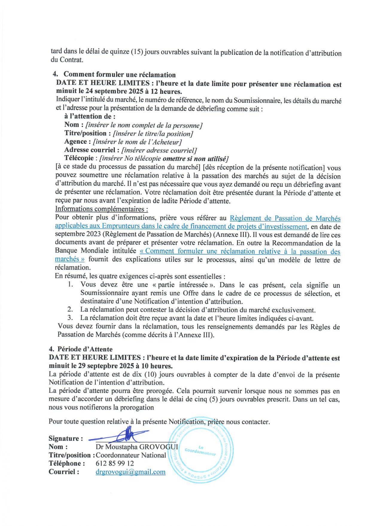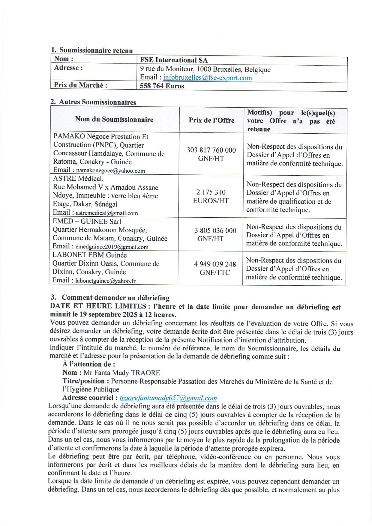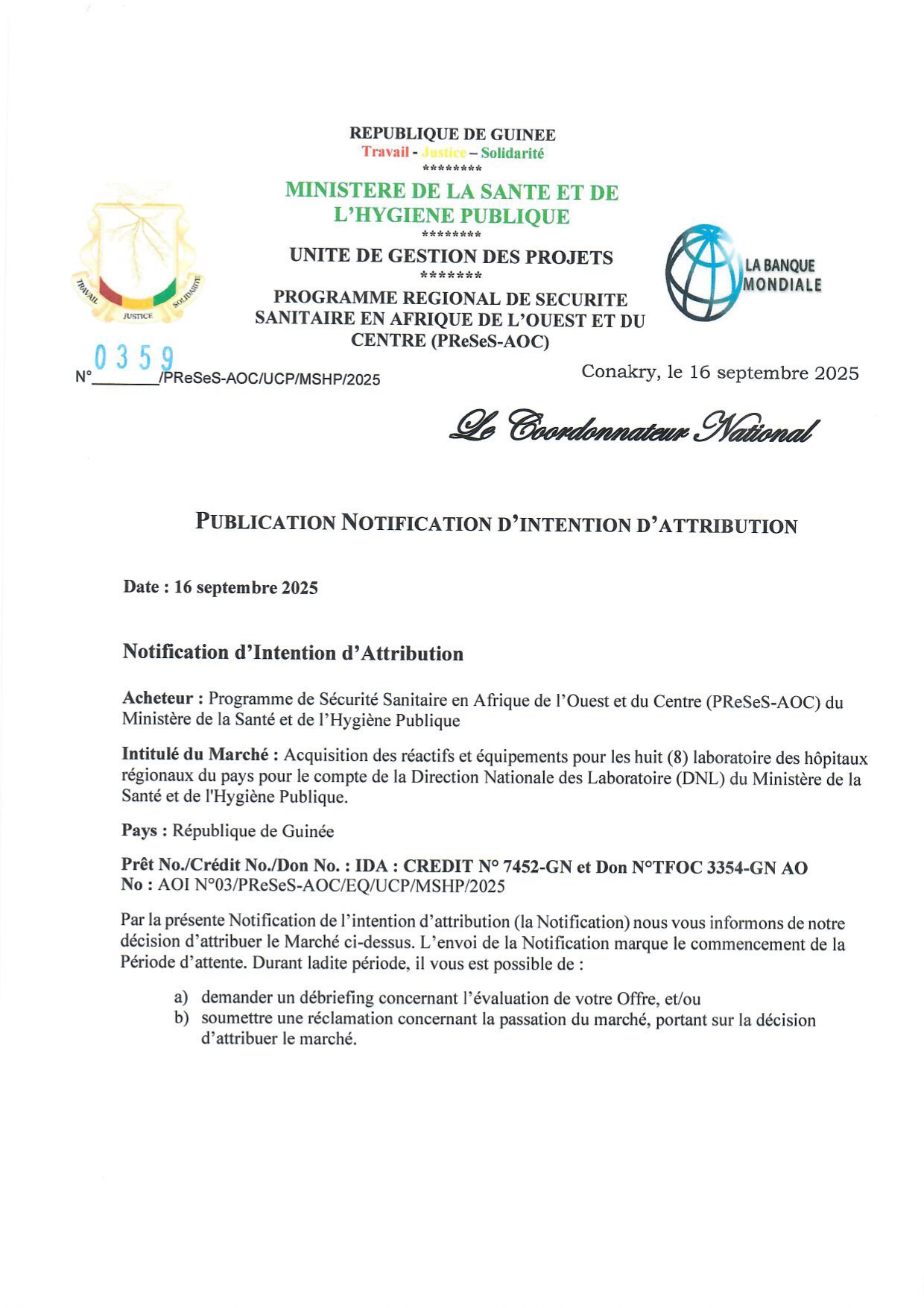 > PUBLICATION NOTIFICATION D'INTENTION D'ATTRIBUTION : Acquisition des réactifs et équipements pour les huit (8) laboratoire des hôpitaux régionaux du pays pour le compte de la Direction Nationale des Laboratoire (DNL)