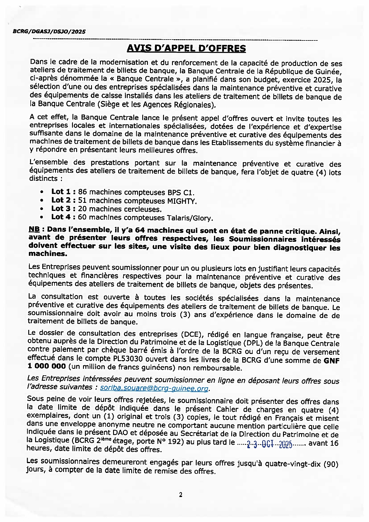 > Avis d'appel d'offres pour la la sélection d'une ou des entreprises spécialisées dans la maintenance préventive et curative des équipements de caisse installés dans les ateliers de traitement de billets de banque de la Banque Centrale (Siège et les Agences Régionales)