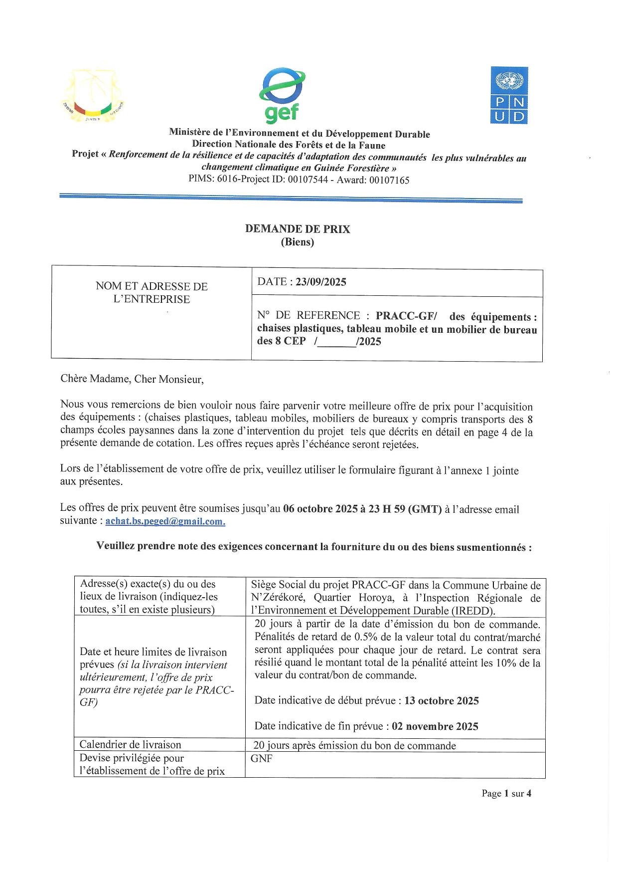 > Demande de prix pour la fourniture d'des équipements : chaises plastiques, tableau mobile et un mobilier de bureau des 8 CEP / /2025