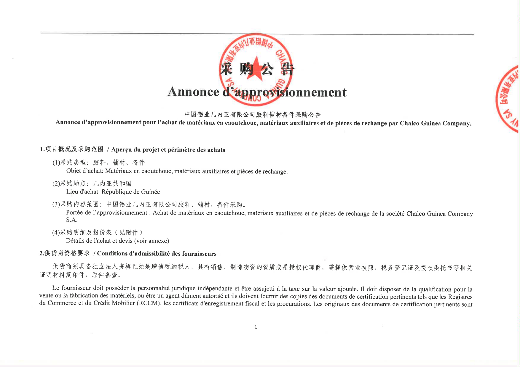 > Annonce d'approvisionnement pour l'achat de matériaux en caoutchouc, matériaux auxiliaires et de pièces de rechange par Chalco Guinea Company
