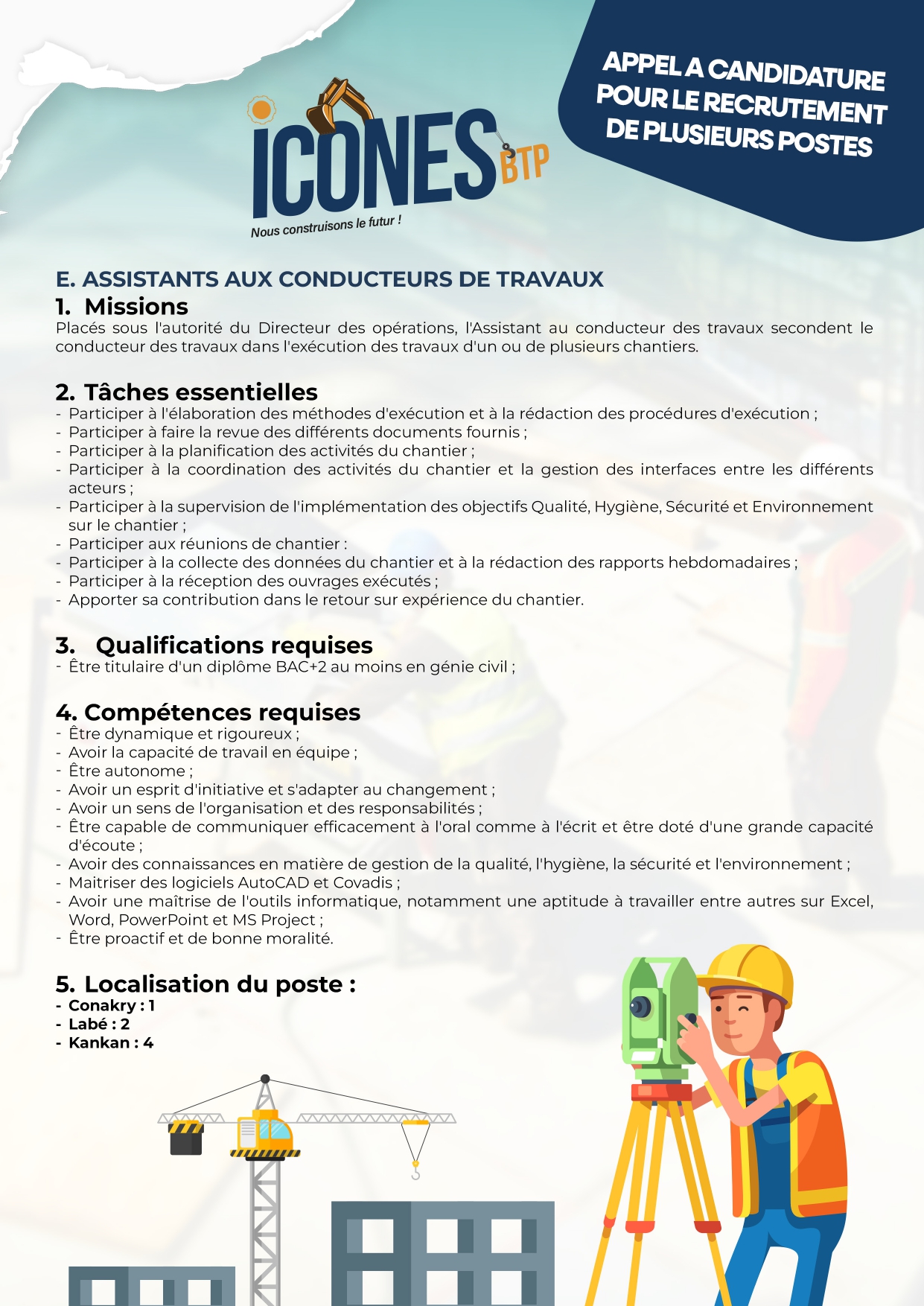 > AVIS DE RECRUTEMENT D'UN ASSISTANTS AUX CONDUCTEURS DE TRAVAUX