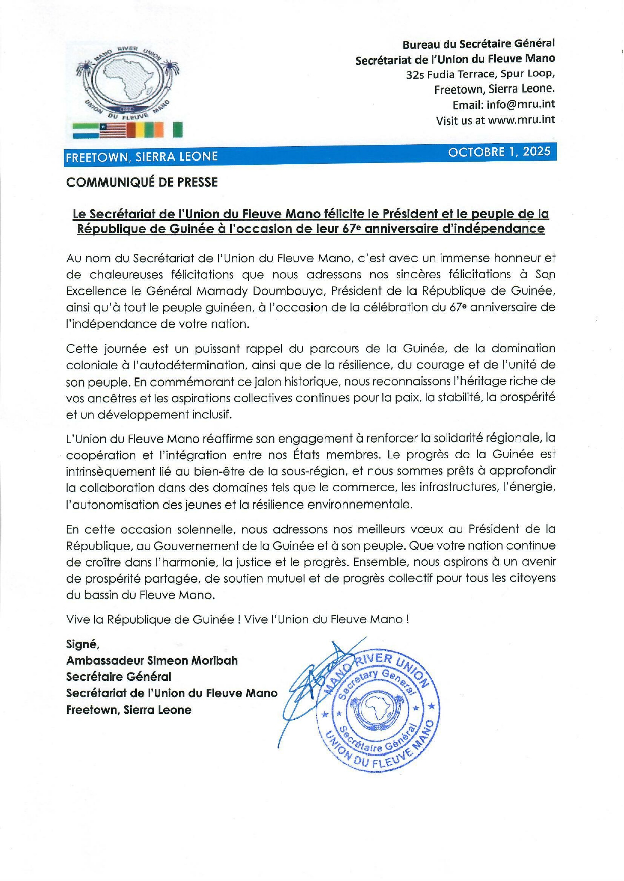 > COMMUNIQUÉ DE PRESSE : Le Secrétariat de l'Union du Fleuve Mano félicite le Président et le peuple de la République de Guinée à l'occasion de leur 67e anniversaire d'indépendance
