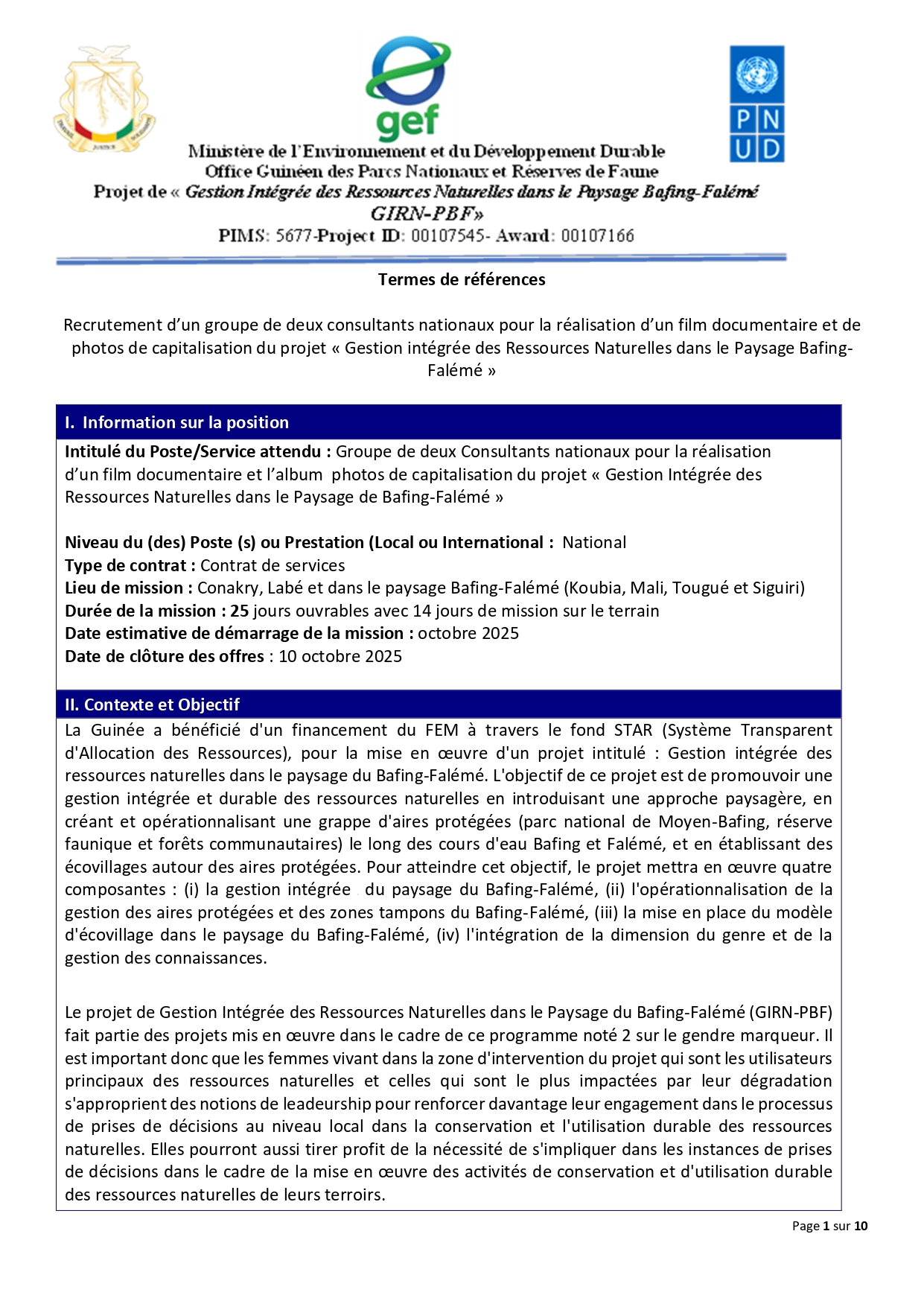 > Termes de références Pour Le Recrutement d’un groupe de deux consultants nationaux pour la réalisation d’un film documentaire et de photos de capitalisation du projet « Gestion intégrée des Ressources Naturelles dans le Paysage BafingFalémé »