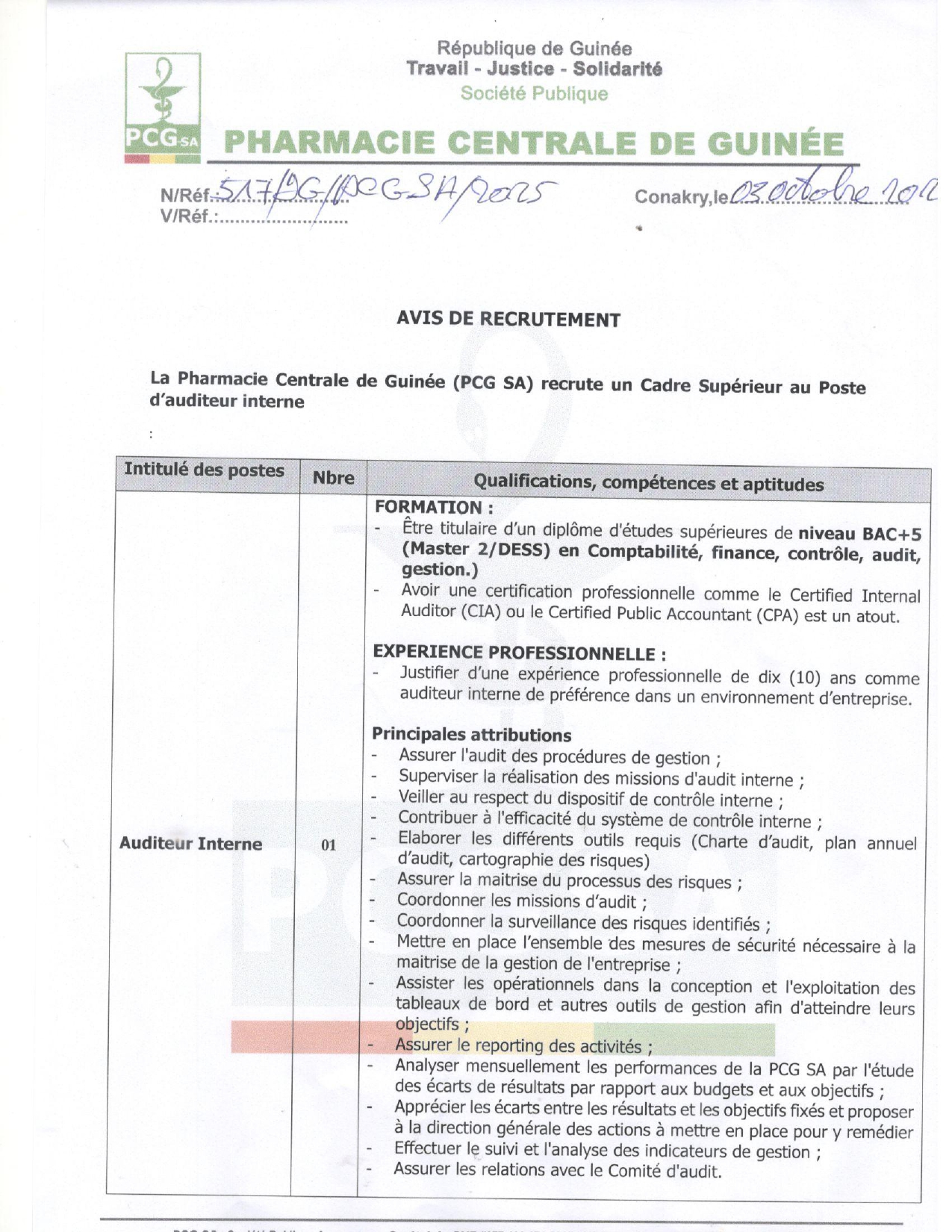 > Avis de recrutement d'un cadre supérieur au poste d'auditeur interne
