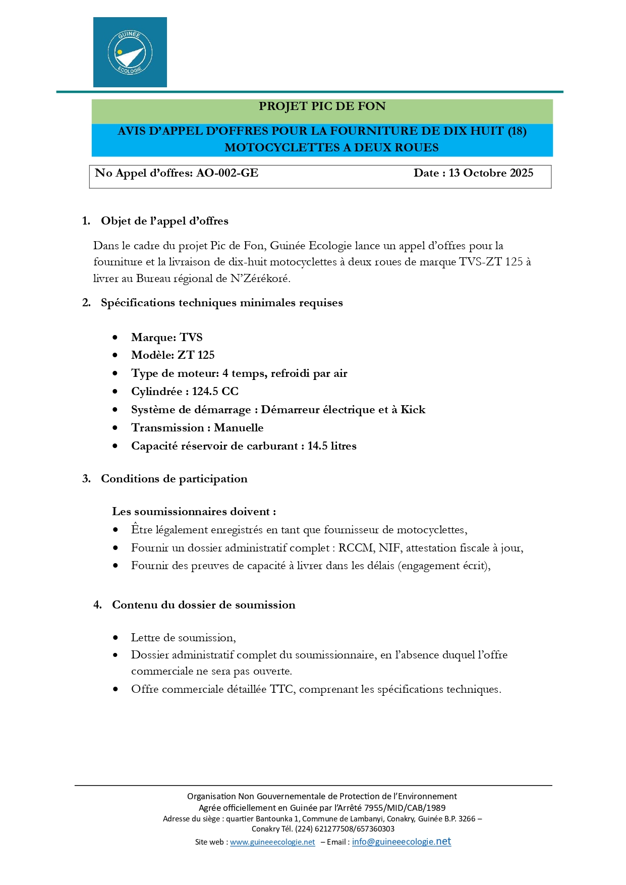 > AVIS D’APPEL D’OFFRES POUR LA FOURNITURE DE DIX HUIT (18) MOTOCYCLETTES A DEUX ROUES