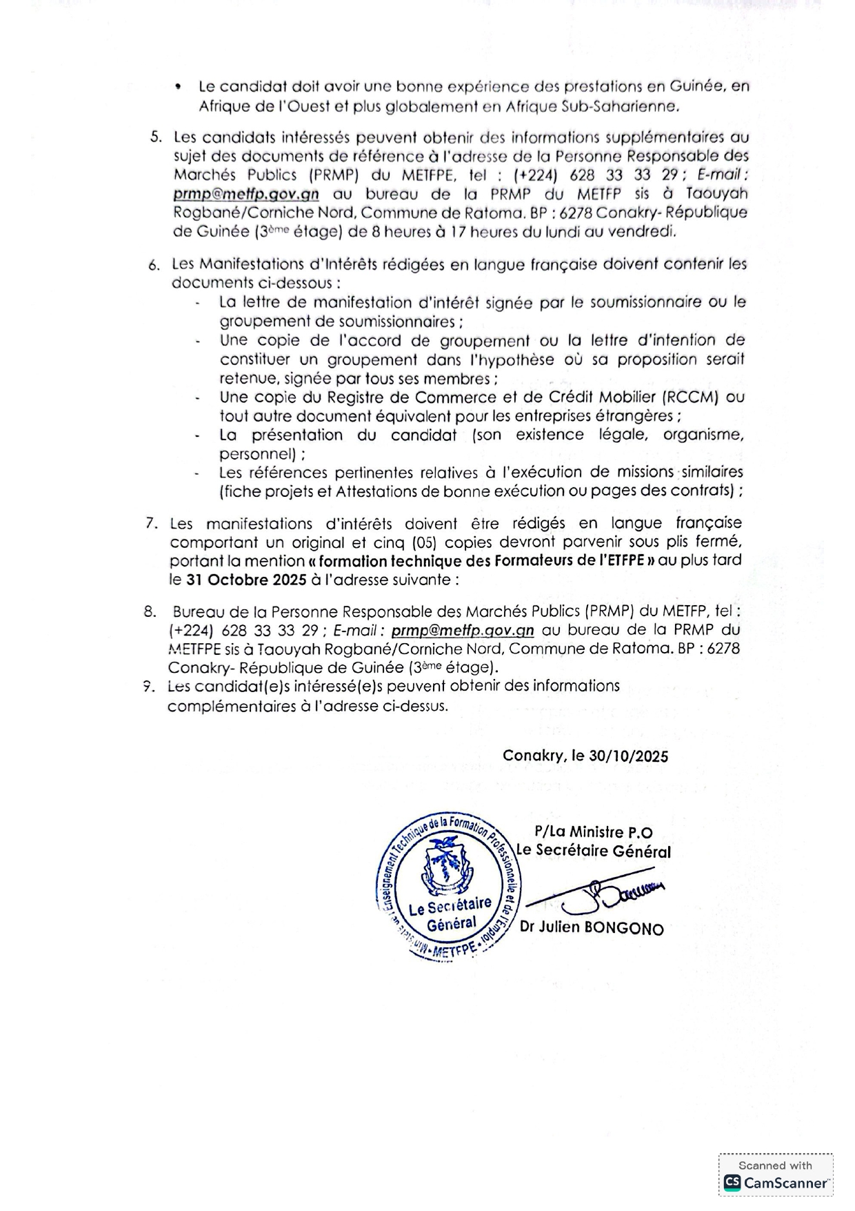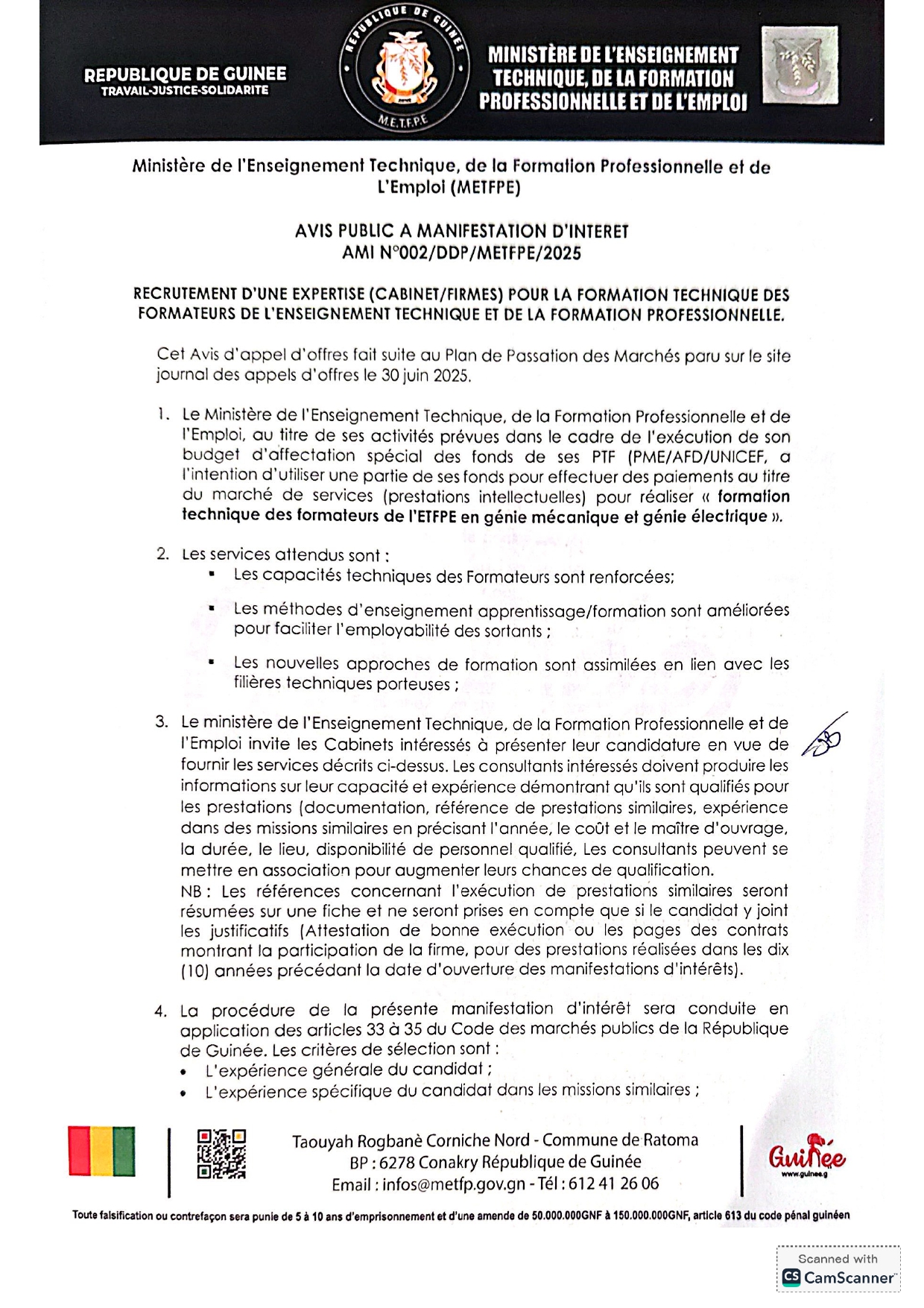 > AVIS PUBLIC A MANIFESTATION D'INTERET POUR LE RECRUTEMENT D'UNE EXPERTISE (CABINET/FIRMES) POUR LA FORMATION TECHNIQUE DES FORMATEURS DE L'ENSEIGNEMENT TECHNIQUE ET DE LA FORMATION PROFESSIONNELL